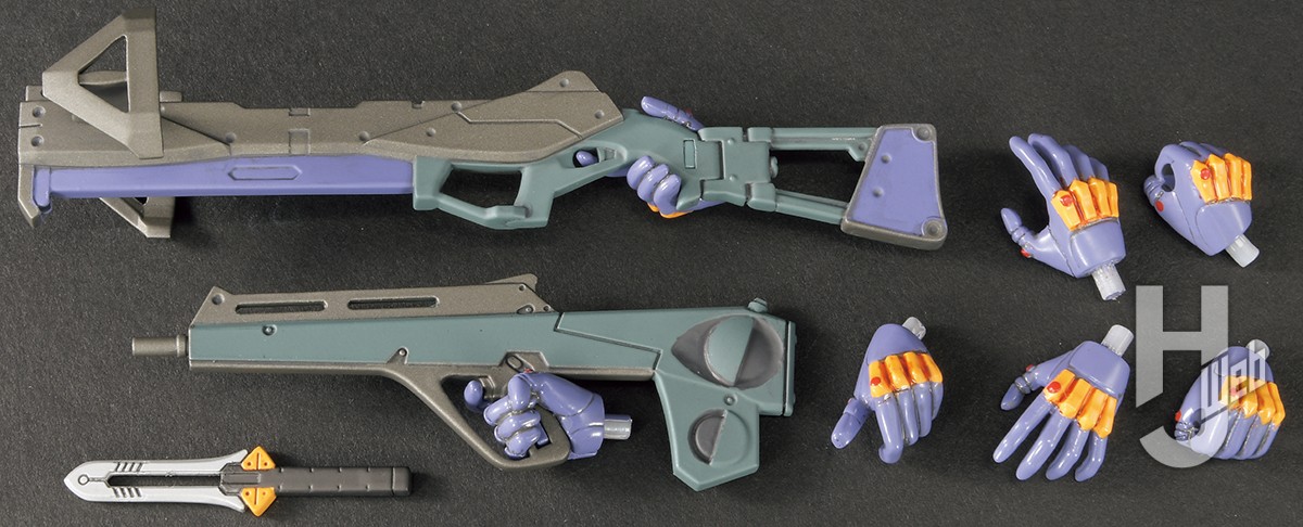 スミ入れはタミヤアクリル塗料のダークグレイで、台所用洗剤で拭き取り。本体はガイアカラー メタリック用クリアーを塗布。最初から希釈されており乾燥も速いようです。武器類はガイアカラー Ex-フラットクリアー プレミアムを吹いて完成です。
