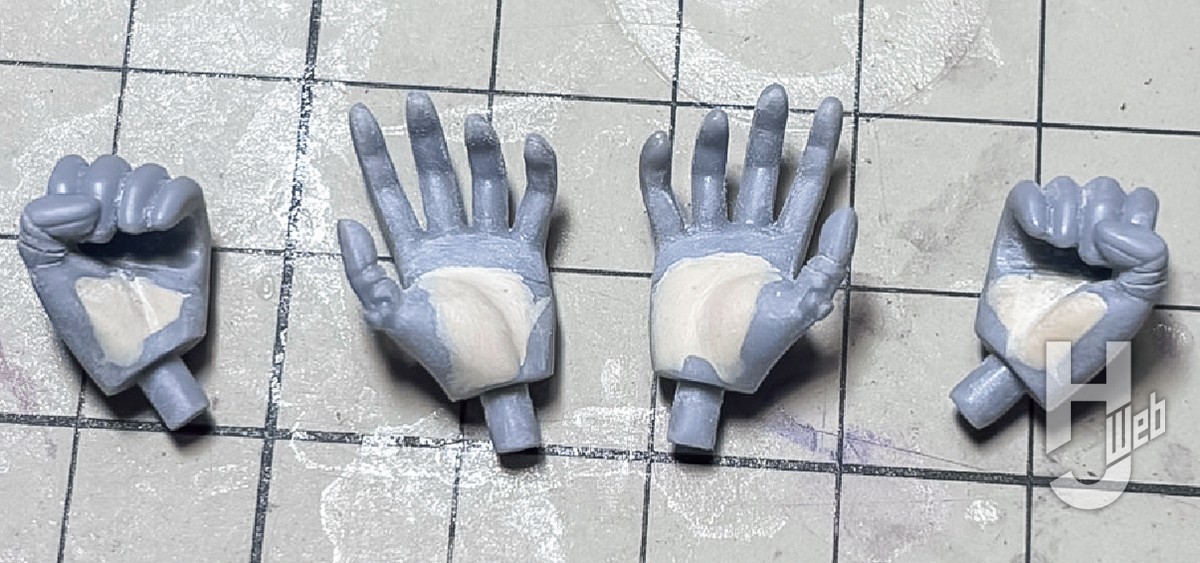 前腕の合わせ目消しは瞬間接着剤で接着しました。前腕や上腕は彩色済の部分があるのですが、いったんすべてヤスリがけして塗装を消し、サーフェイサーを吹いて塗り直しています。