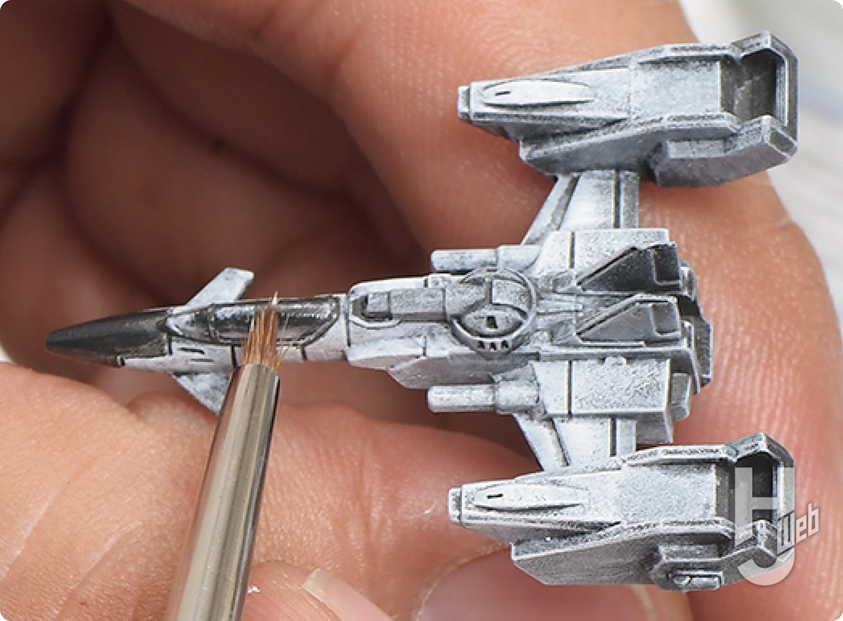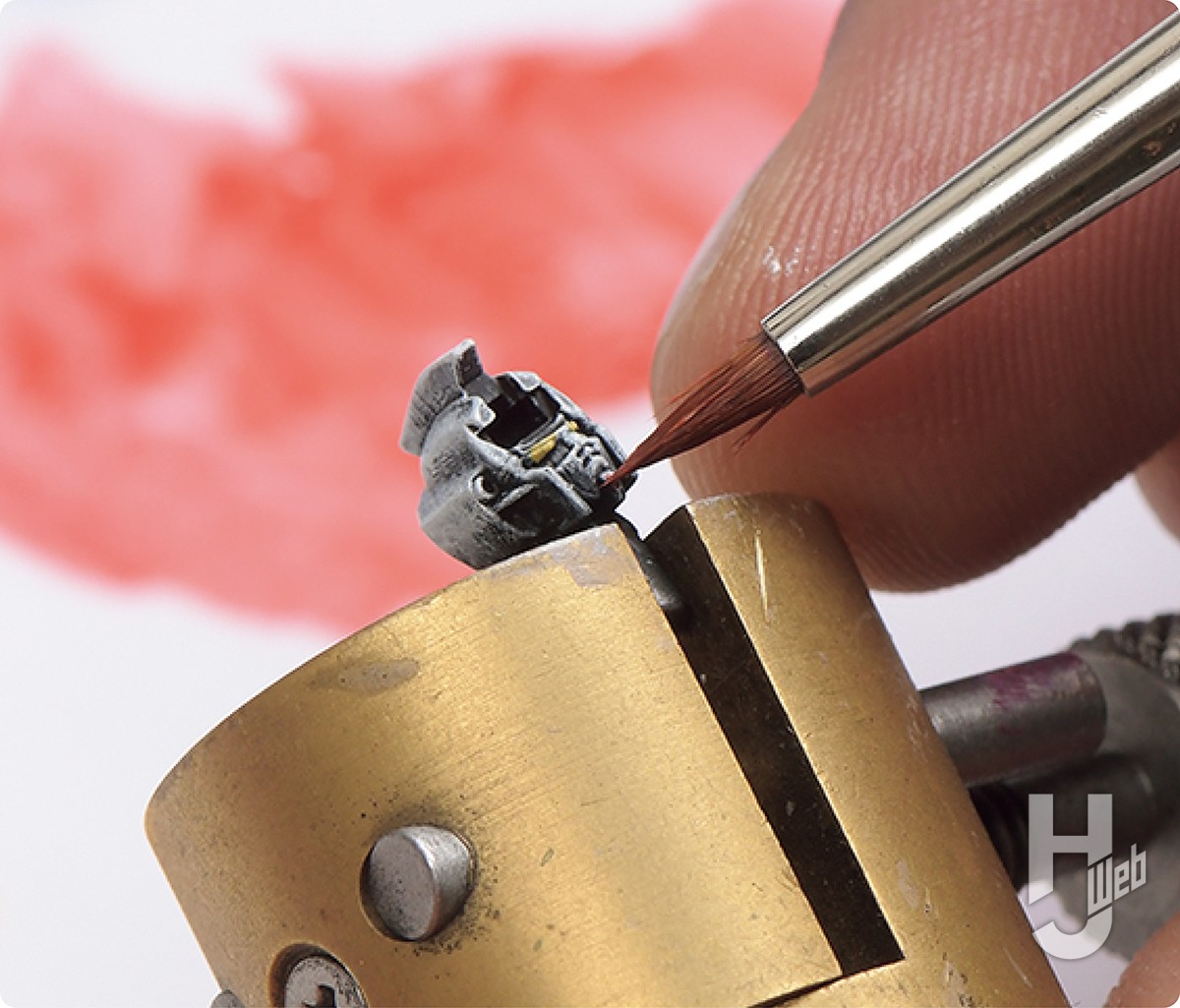ストライクガンダムやスカイグラスパーに配色された赤や青、黄色は下地が「白」であれば手早く発色し、鮮やかに塗ることができる。本体のドライブラシで塗った白を活かして上塗りしていく。