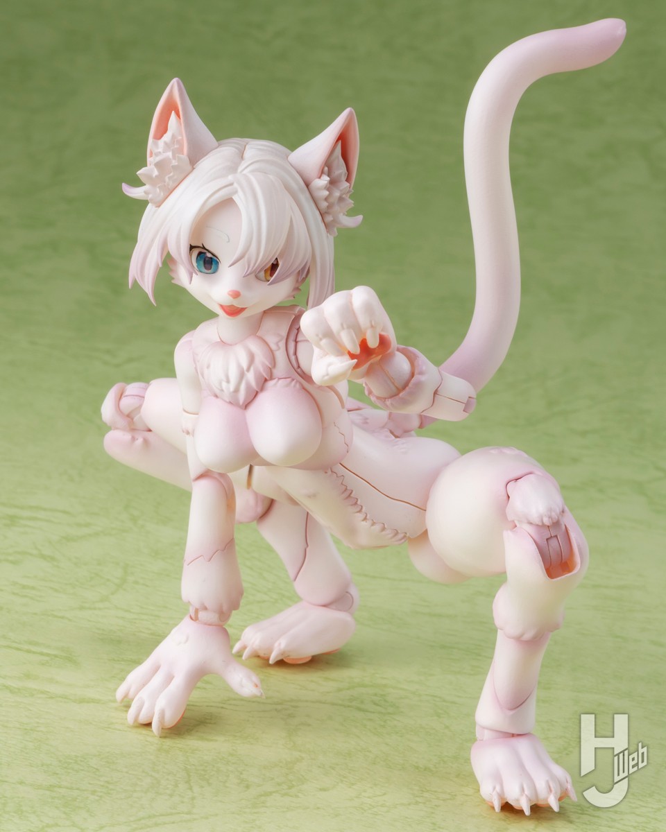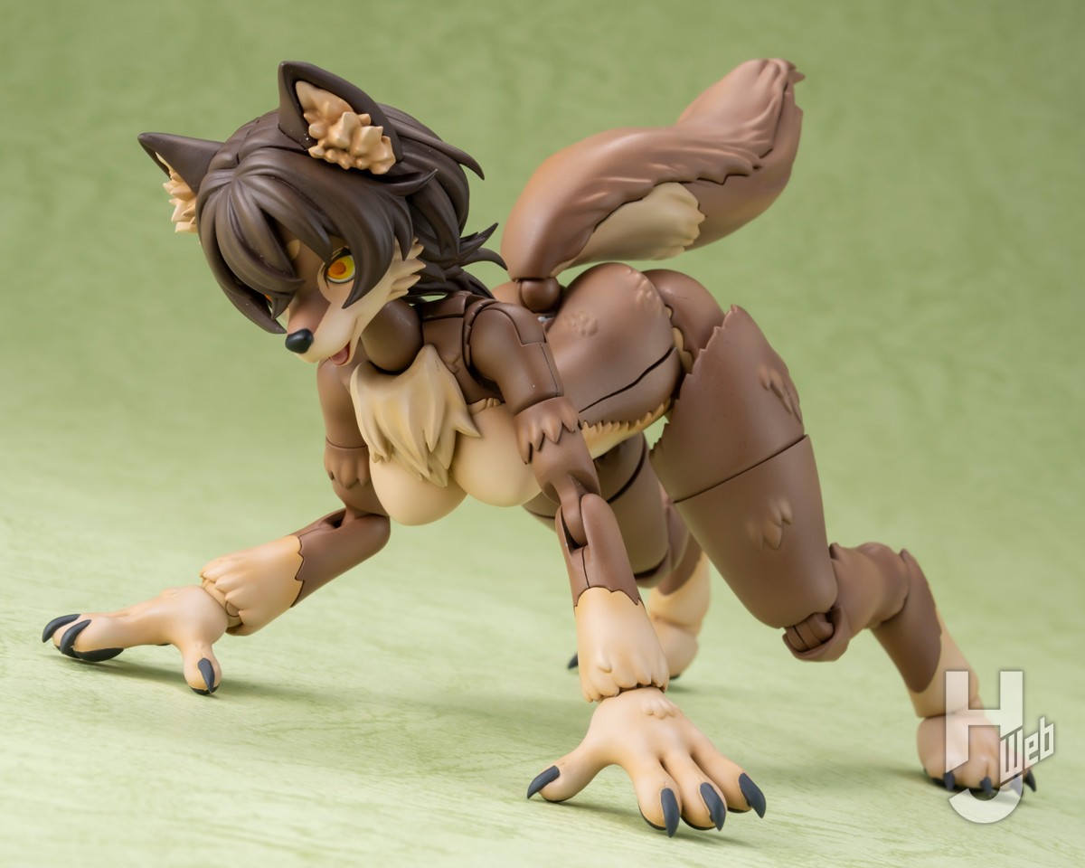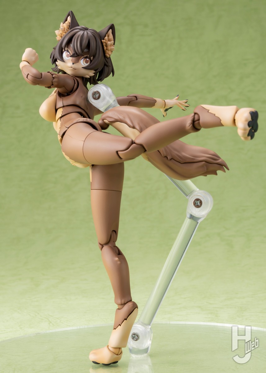 ▲ 可動面も盤石で、ヒトとは違うテイストのポージングが楽しめる。高ケモの股関節は「ケモフリングシステム」と名付けられた構造で、ぐぐっと脚を拡げて腰を落とすことができる ※写真中の台座は付属しません