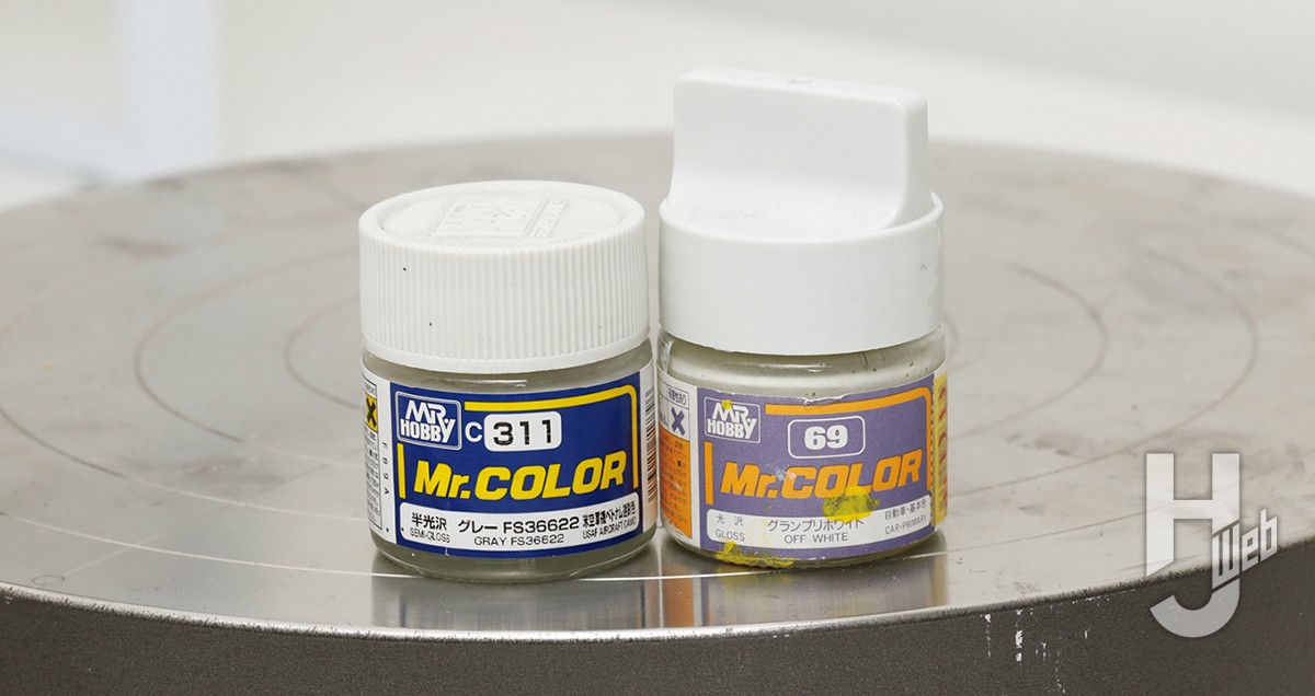 ▲ジェット機の塗装でよく使用されるほぼ白色のグレー「グレーFS36622」と、黄色味がかった白の「グランプリホワイト」を爪や目の塗装に使用