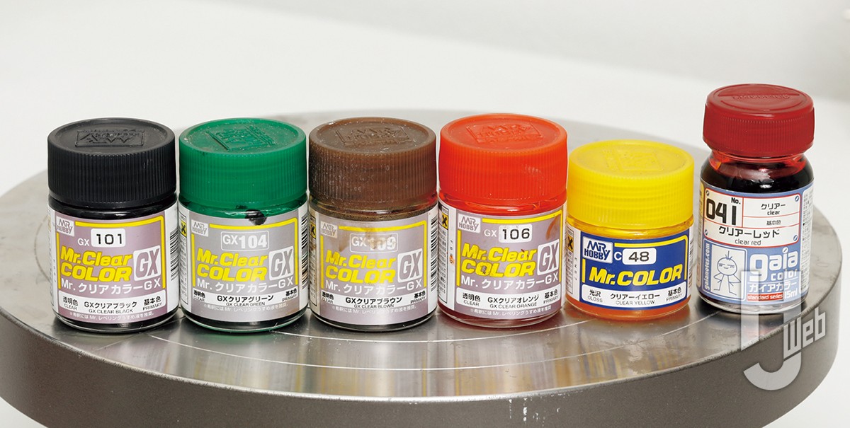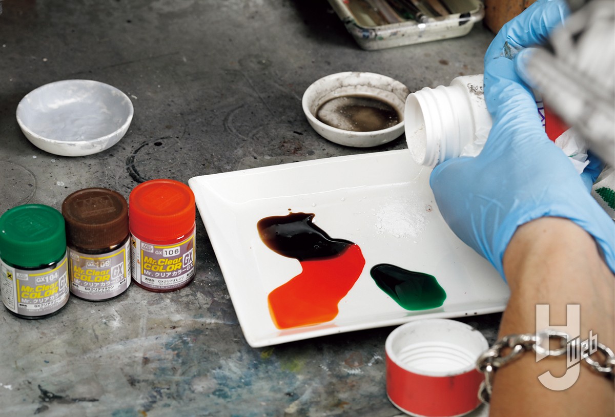 ▲下地の上からグレーを塗る。まずはGSIクレオスの「GXクリアグリーン」「GXクリアブラウン」「GXクリアオレンジ」を皿に出し、タバコライオンを加える