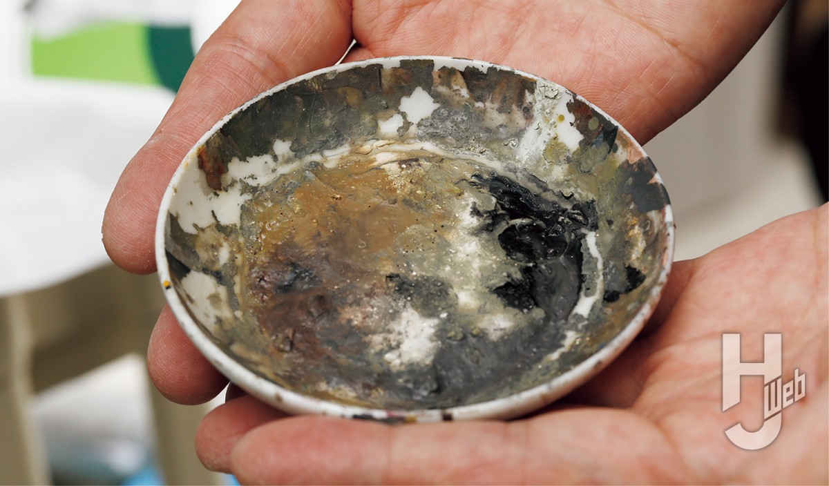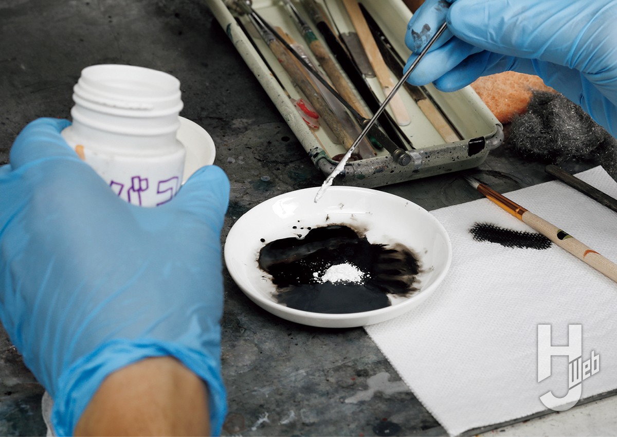 ▲こちらは何年も継ぎ足して使用している「オリジナルグレー」。さまざまなグレーが混ざり合ってまるで地層のようになっている。ラッカー塗料は一度固まっても溶剤を入れれば再度使用可能。こちらのグレーを今回使用する色に混ぜて深みを出していく