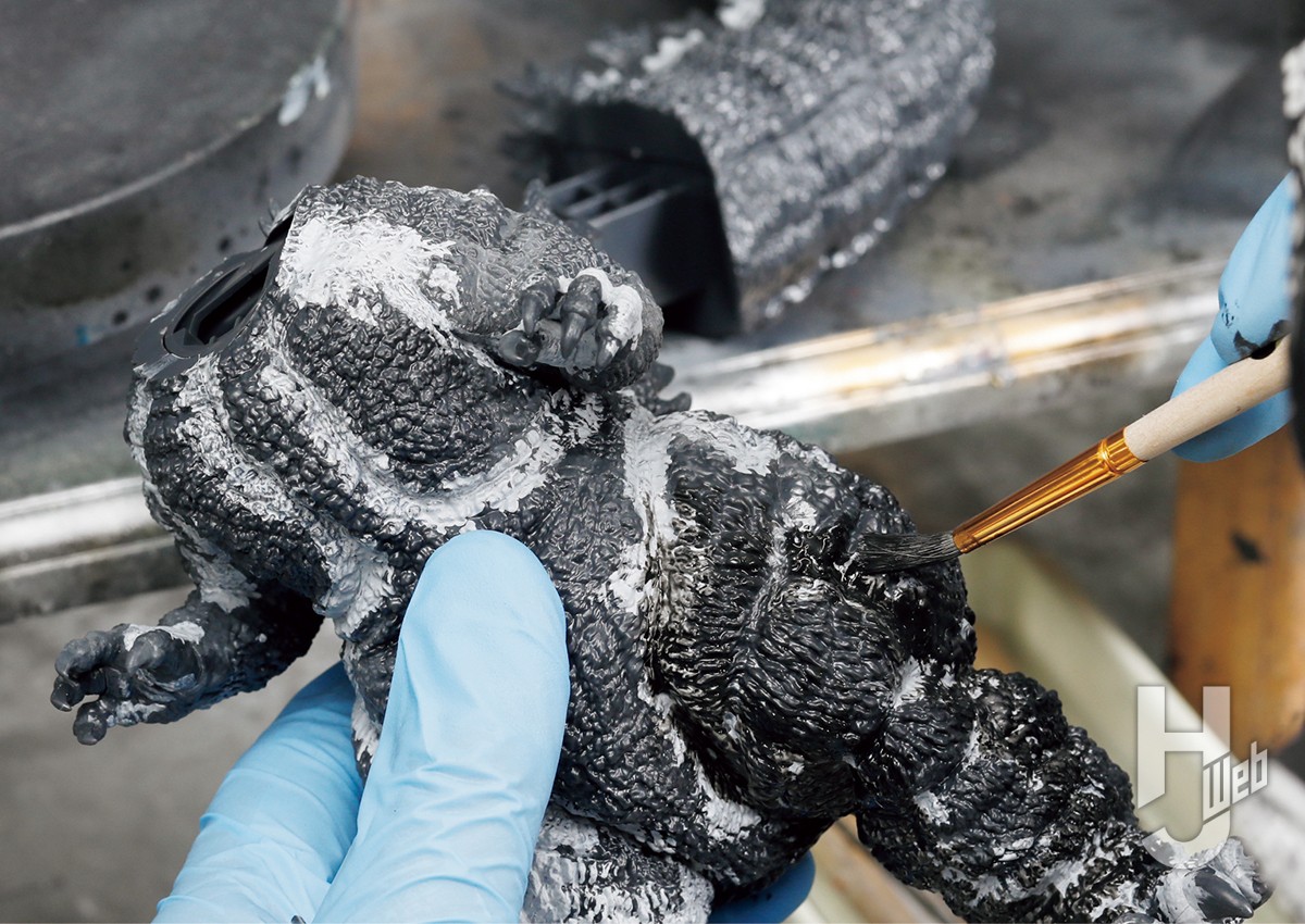 ▲うすめ液で緩めに溶いた塗料を、ゴジラの細かなモールドに流し込むように塗っていく