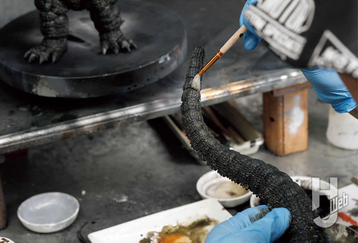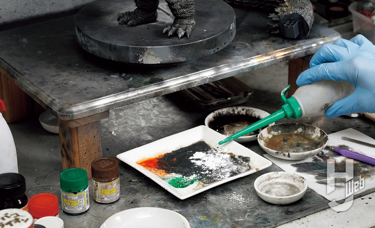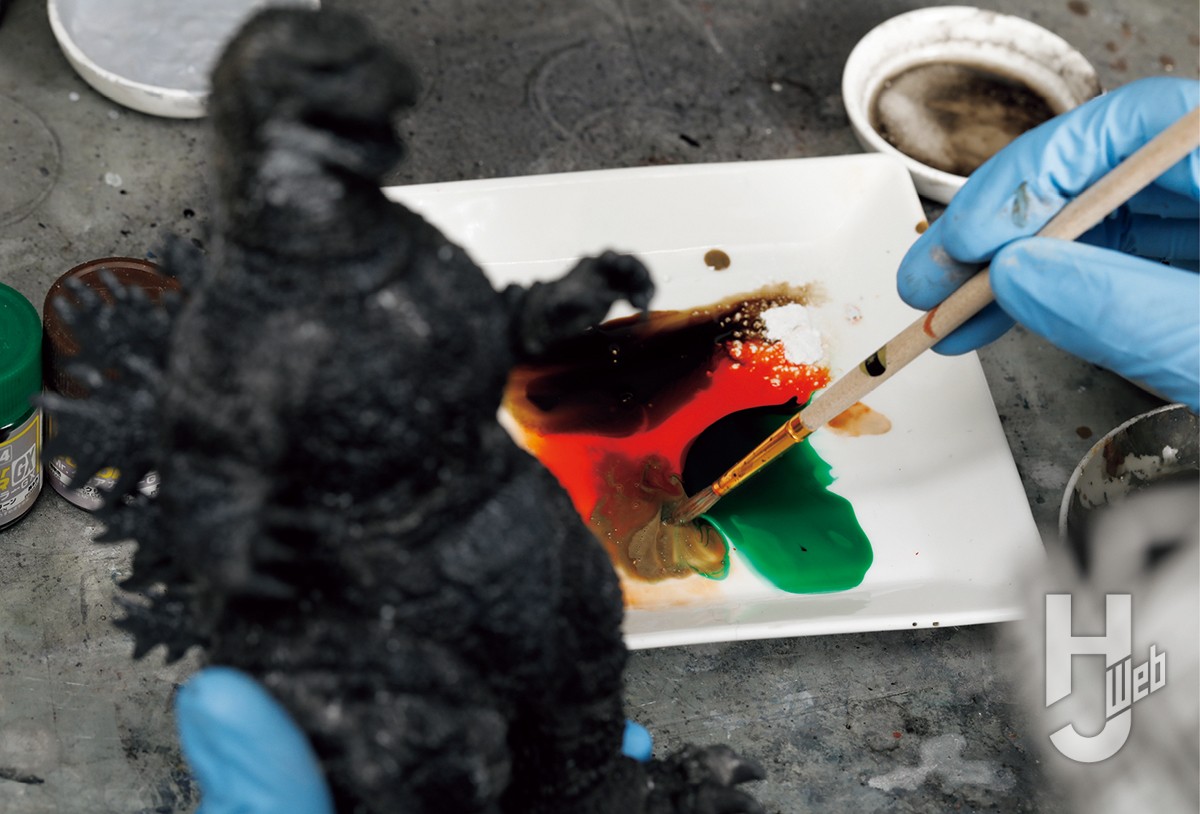 ▲ゴジラのグレーに、さまざまな色味を加えるのにクリアーカラーを使用。グレーに濁ることなく赤みや黄色みを足せて、下地の透け感も活かせる