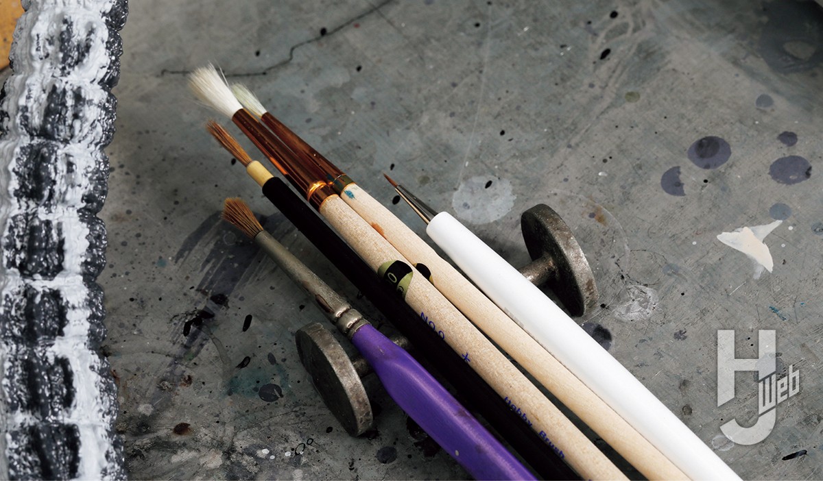 ▲伊原源造は「丸筆」を愛用。今回は上野文盛堂の丸筆や、過去に伊原がディレクション&プロデュースしてモデルカステンから発売された模型用筆「progress brush」で基本塗装。目などの細部はタミヤ モデリングブラシPROII 細を使用している