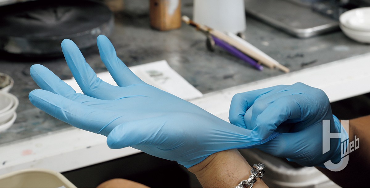 ▲手が汚れたり、大きな指紋が付くのを予防するために、薄い作業用の手袋を着用。100円ショップやドラッグストアで購入できる