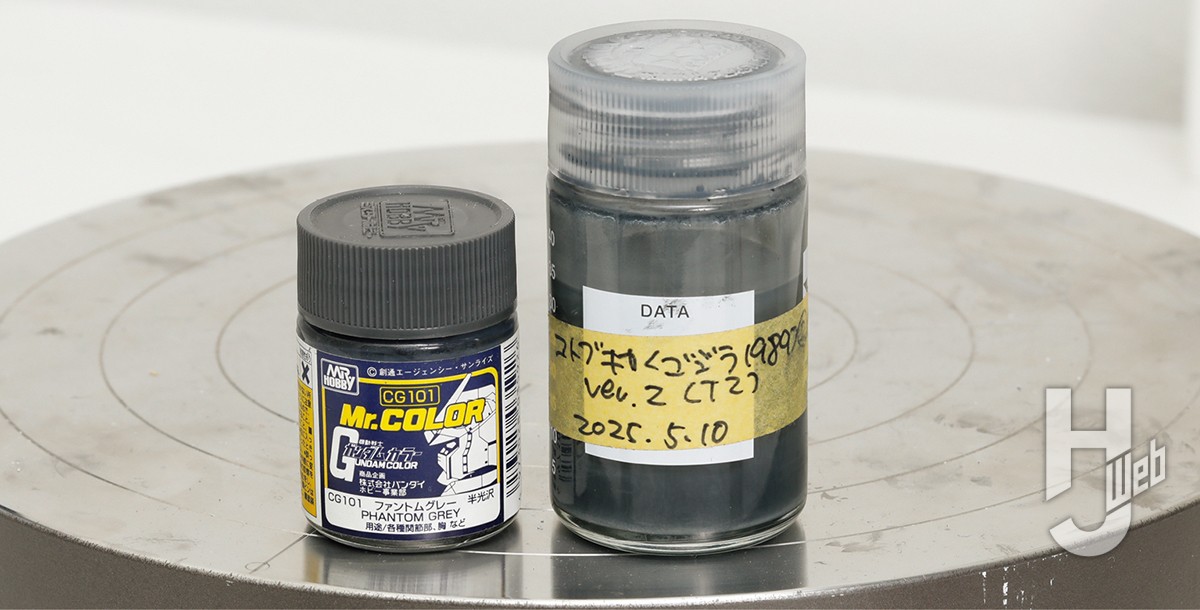 ▲メインカラーとなるグレーは、ガンダムカラーの「ファントムグレー」。隣にあるのは、コトブキヤの完成見本を塗った際に調色したグレー。今回こちらは使用しない