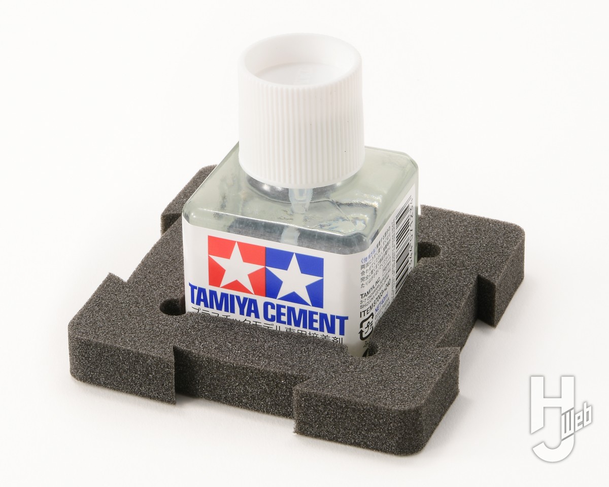 ▲ こちらは接着剤ではありませんが、ビンを倒してしまわないようにする台座。タミヤの40mlの角ビン各種に対応し、連結用パーツで複数つないで使うこともできます