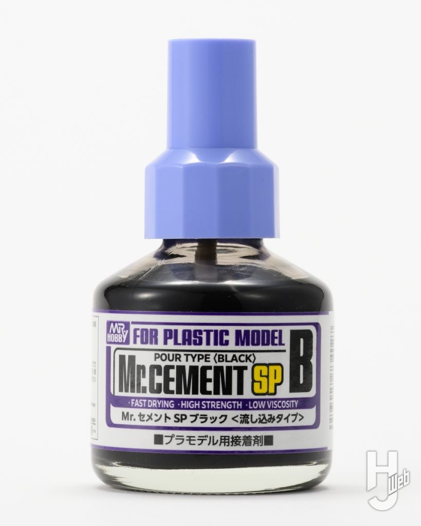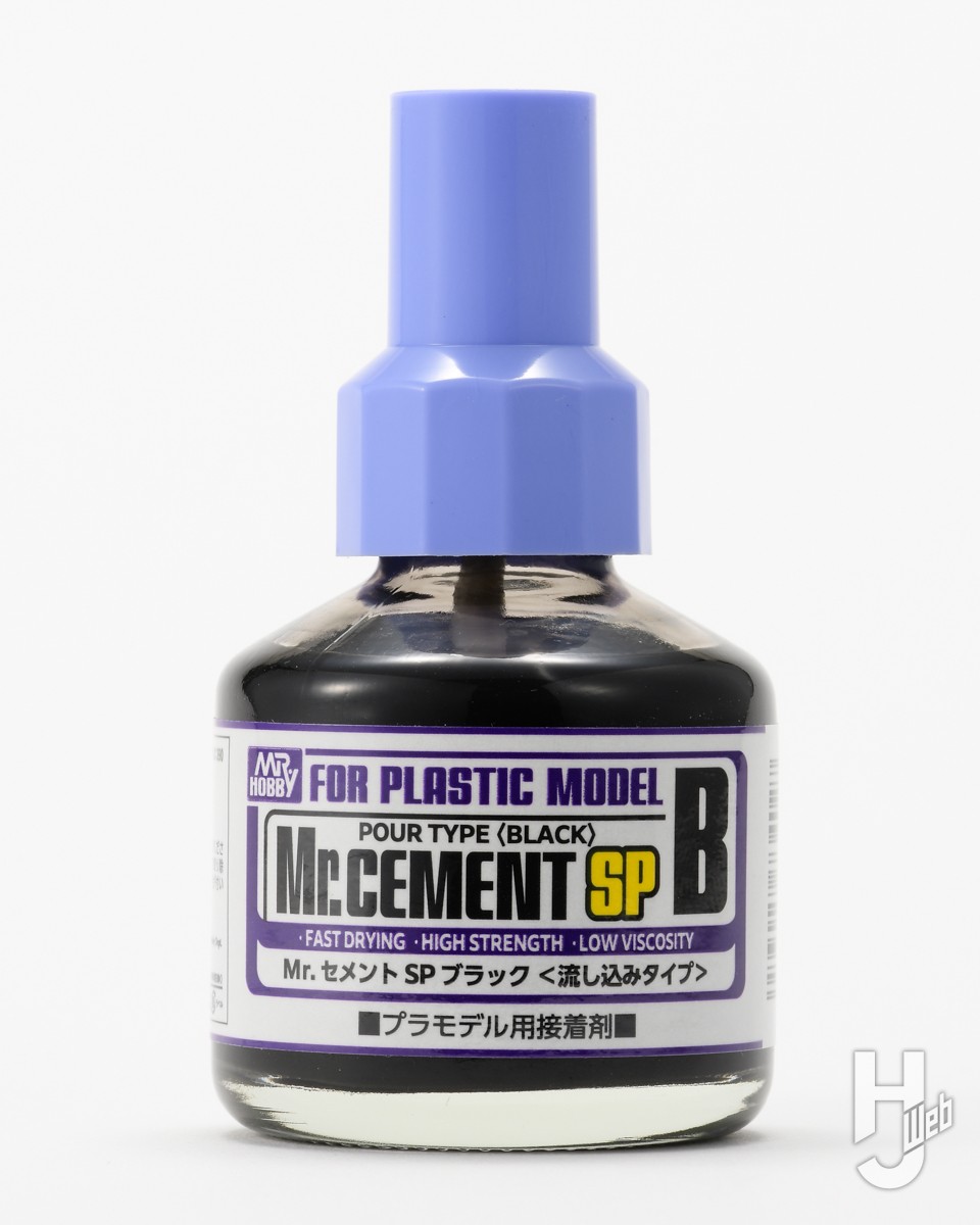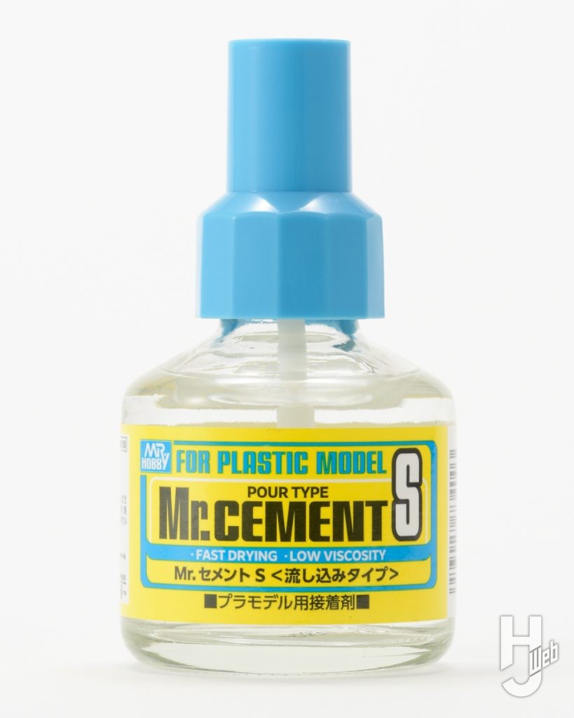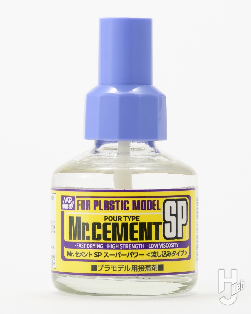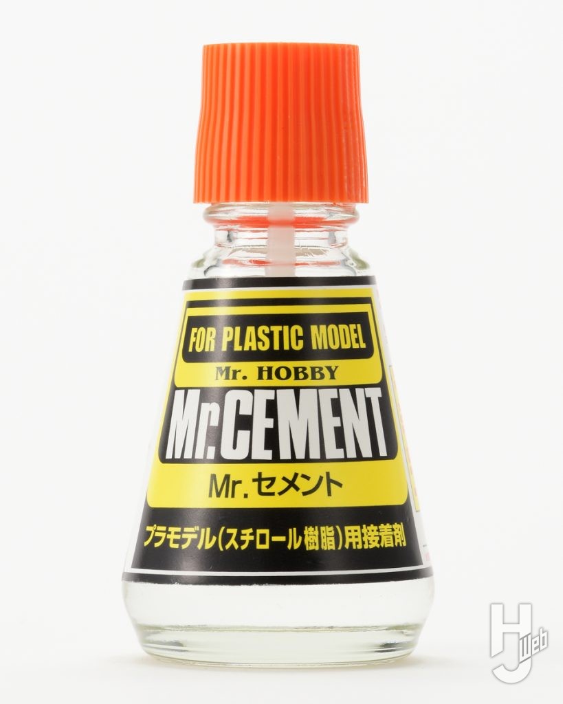 ▲ Mr.セメントの流し込みタイプ。無樹脂のサラサラの液状で、パーツを合わせた隙間に流すように使います。「SP」ほどの速乾ではありませんが、乾燥時間は早めです