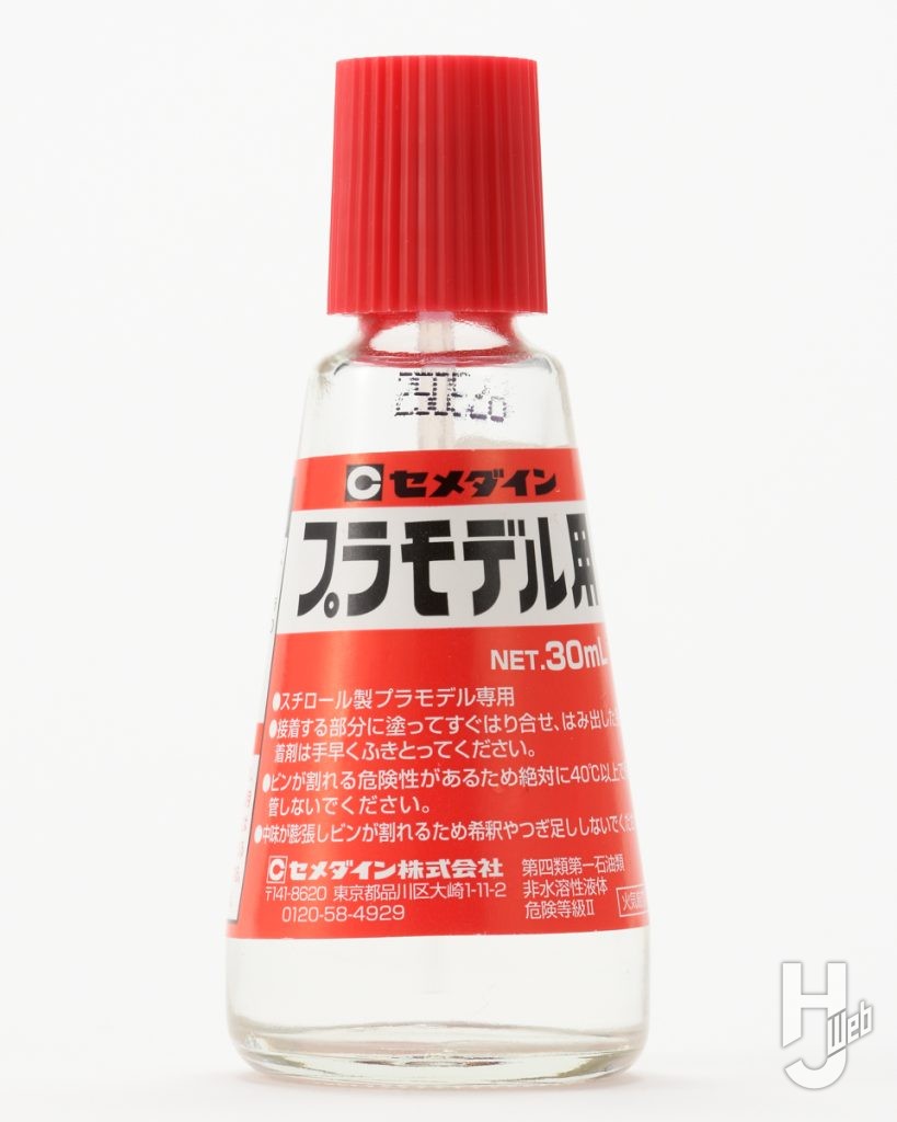 ▲ セメダイン社の「プラモデル用」はロングセラーとなっている樹脂入りタイプのプラセメント。このタイプとしては細めのハケが付属して、小面積に塗りやすくなっています