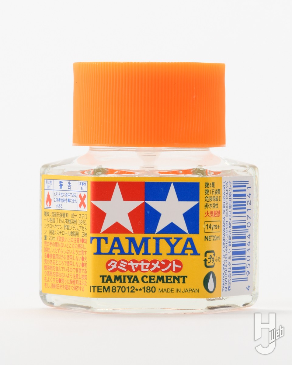 ▲ タミヤの六角ビン。スタンダードな樹脂入りタイプ。樹脂成分はパーツ同士を“つなぎ”として少しの隙間埋めや補強になり、しっかり固定することができます。キャップ裏にハケが付属しています