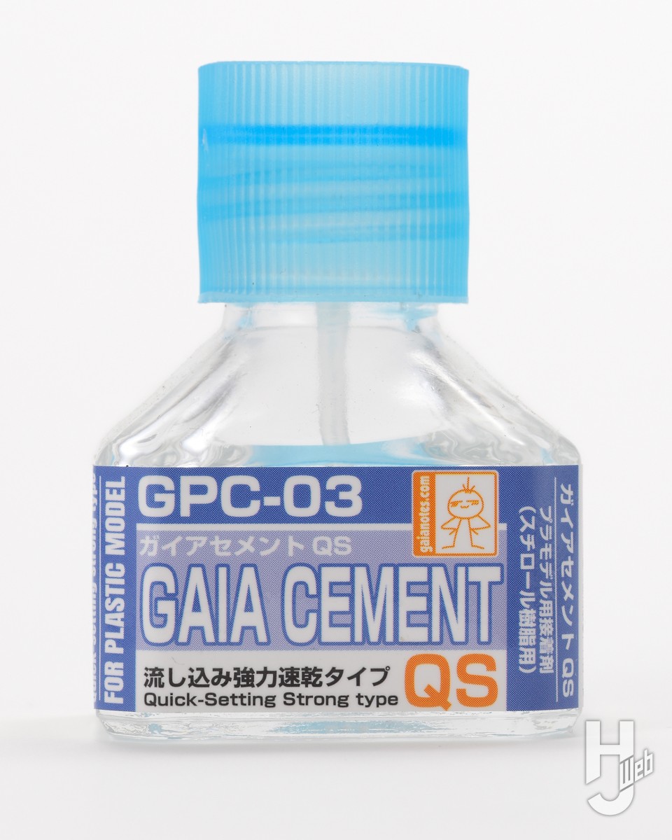 ▲ ガイアノーツの流し込み接着剤。素早く乾いて接着が完了する速乾タイプ。樹脂入りタイプに加えて粘度を低めるのにも使えます。細く長めのハケでセメントを含みやすくなっています