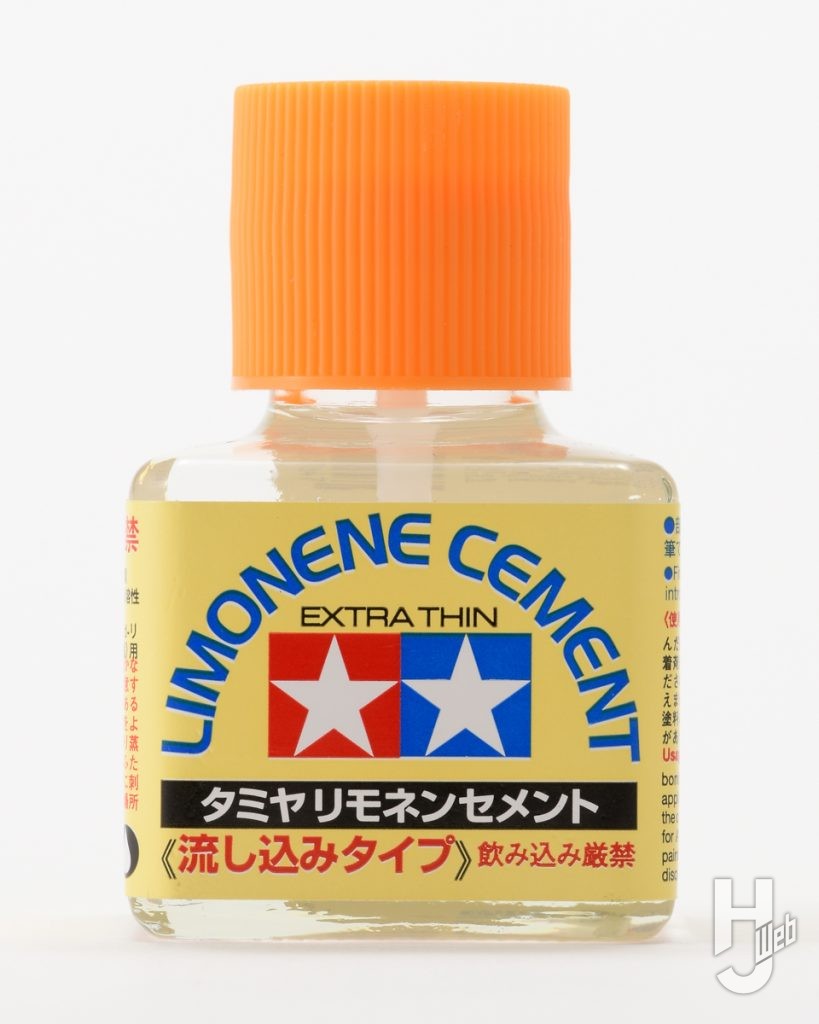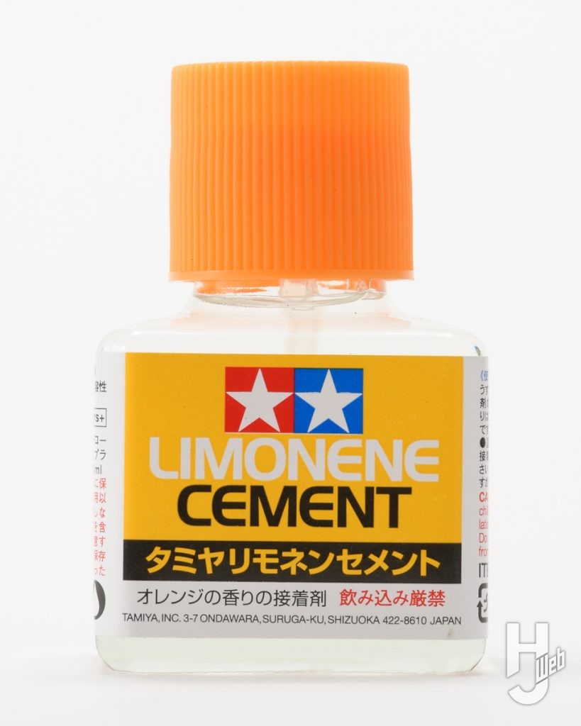 ▲ 柑橘類から抽出されるリモネンを使用し、有機溶剤の臭いをなくした接着剤。こちらは樹脂入りタイプ。リモネン系のプラセメントは初期の接着力が弱めなものの、乾燥すれば他と同様に強固に接着されます
