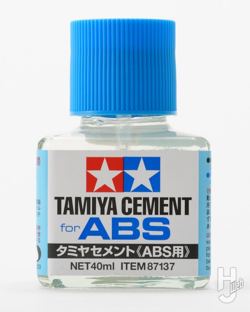 ▲ プラモデルの各所に使用されるABSパーツ用の接着剤。樹脂入りタイプで、ABSとスチロール樹脂の接着にも使えます。通常の樹脂入りタイプ(スチロール樹脂用)ではABSは接着できないので、注意しましょう
