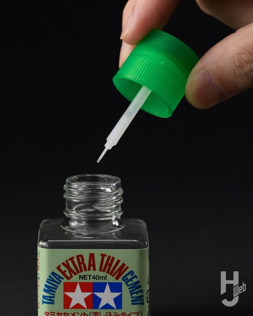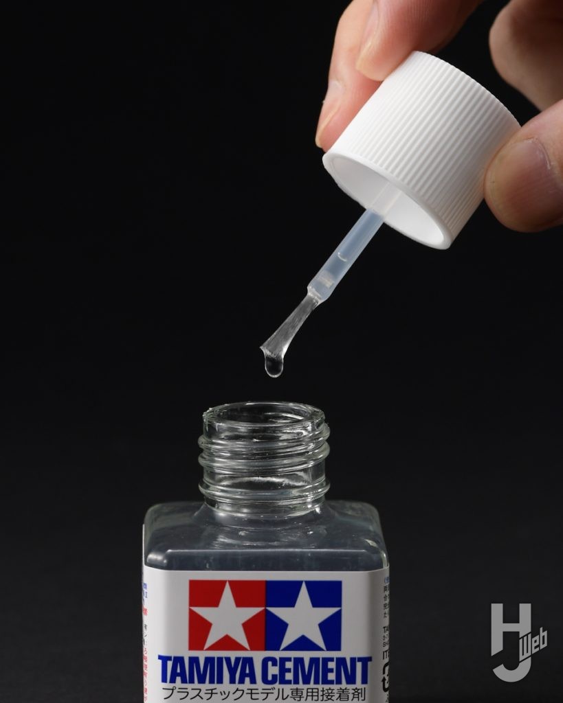 ▲ サラサラしていてパーツ同士の隙間に毛細管現象で流し込んで接着することができます。樹脂入り接着剤と違い、先にパーツ同士を合わせてから接着する使い方になります。乾きが早くハミ出した跡も目立ちにくいのが特徴。パーツの合わせがよい現在のキットの組み立てでは、このタイプを使うことが多くなっています