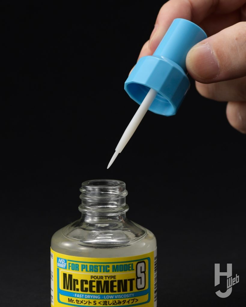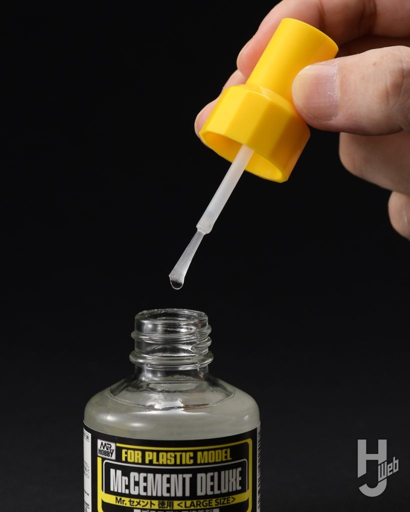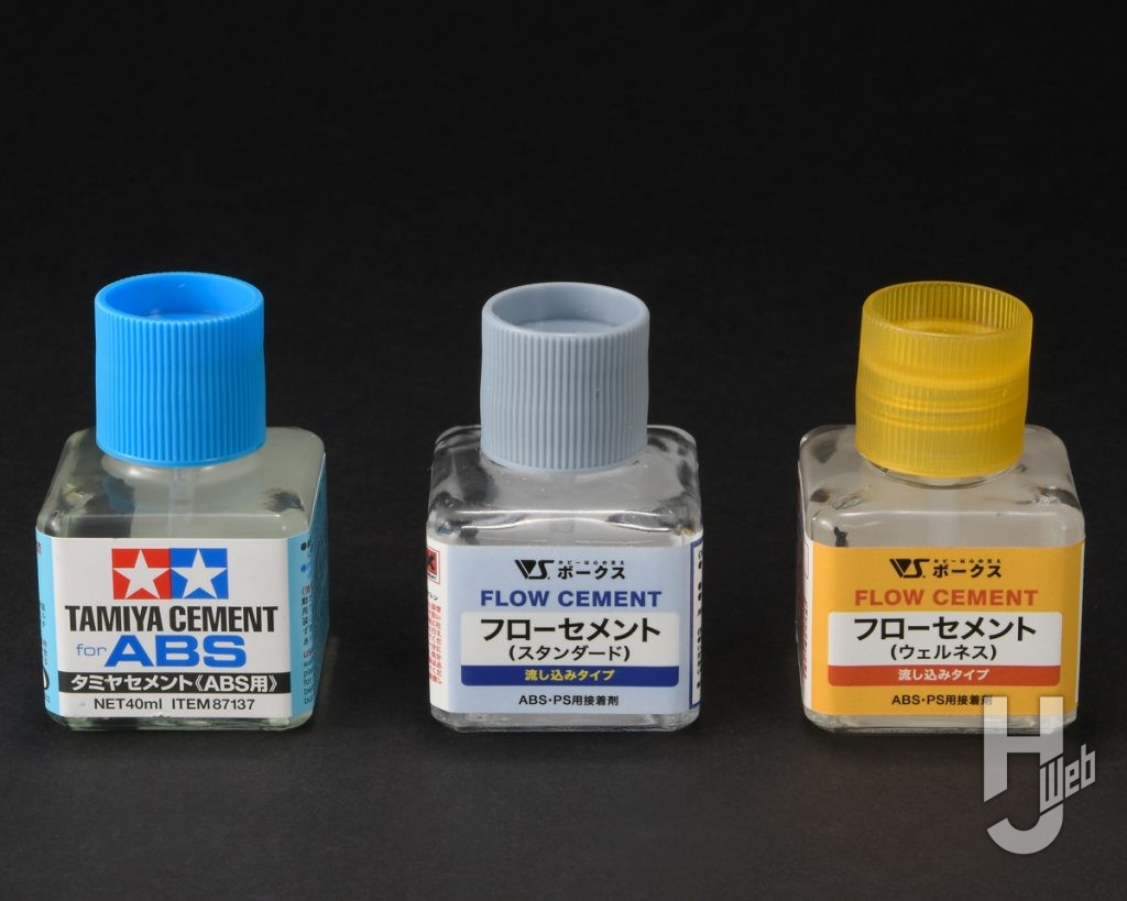 ▲ スタンダードなプラセメント(樹脂入り)ではABSは接着できません。そのためABS樹脂に対応したプラセメントを用います。こちらも樹脂入りと流し込みがあり、ABS同士、ABS+スチロールが接着できます