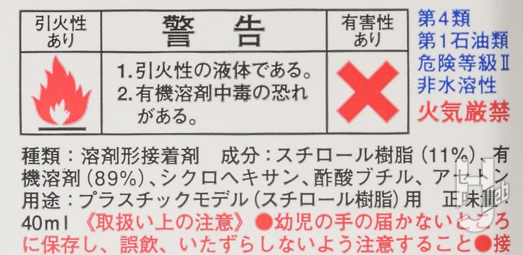 ▲ タミヤセメントの成分表記。有機溶剤の中にスチロール樹脂が11%含まれています