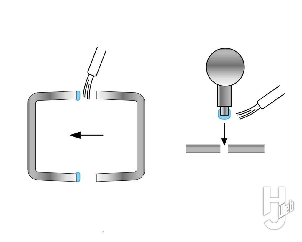 ▲ スタンダードタイプ(樹脂入り)は接着面の片方に塗り、貼り合わせます。乾いて固定されるまで時間があり、位置などの微調整ができます。ハミ出しに注意します