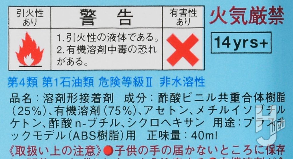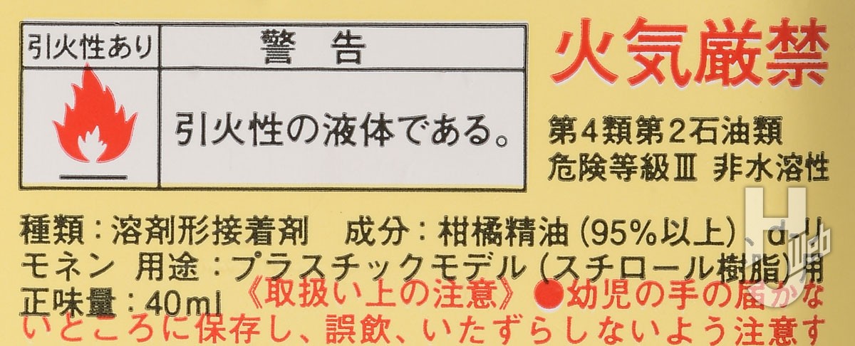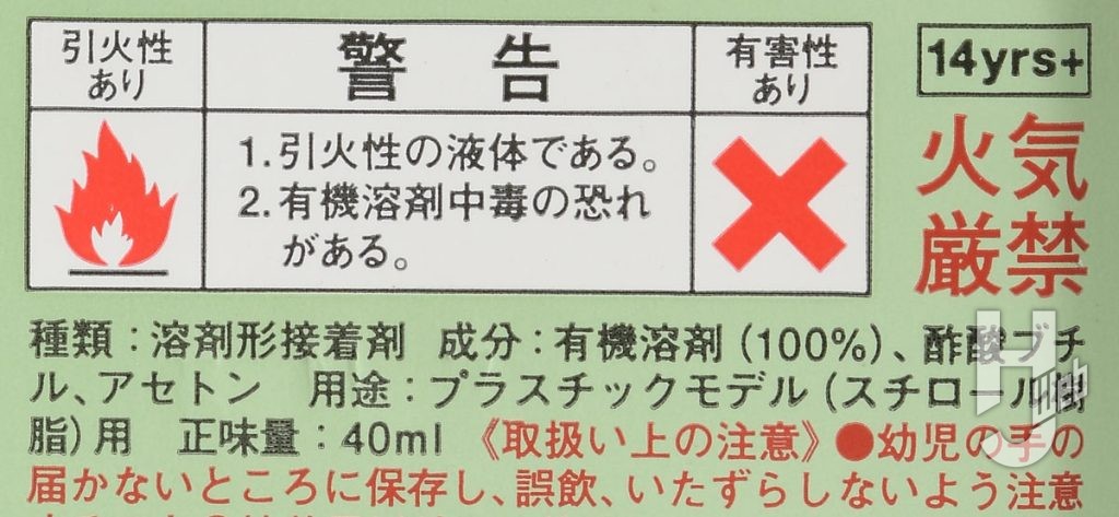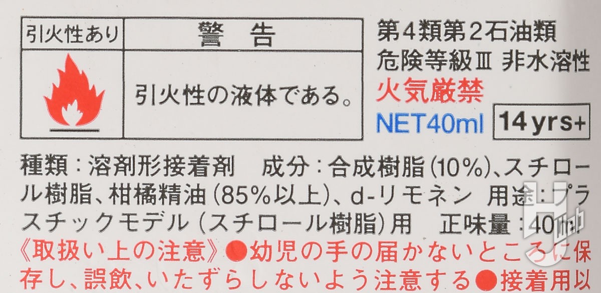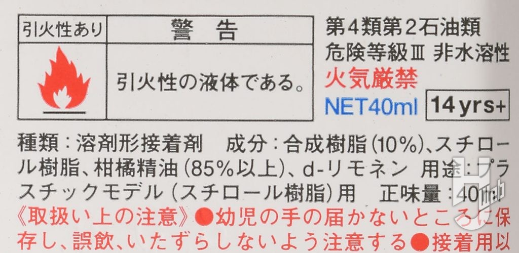 ▲ タミヤセメント(流し込みタイプ)の成分表記。成分は有機溶剤100%です