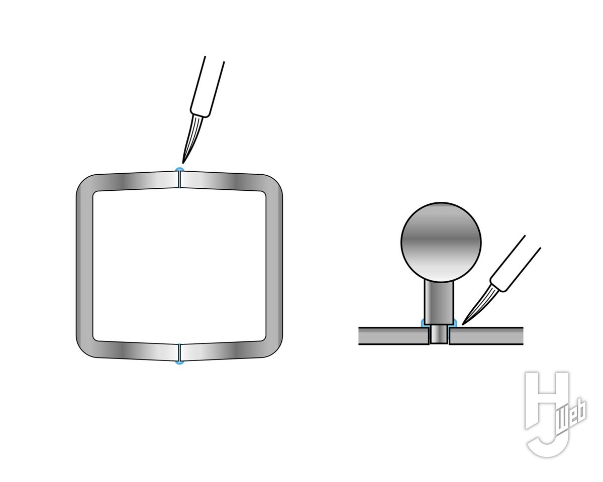 ▲ 流し込みタイプでは先にパーツ同士を合わせておき、そこに筆先を付けて毛細管現象を利用して合わせ目に接着剤を流し込みます。乾燥が速く、手早く接着が完了します