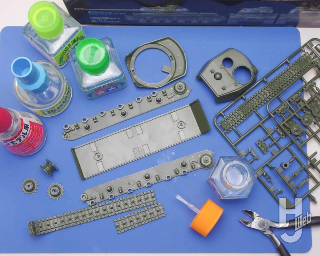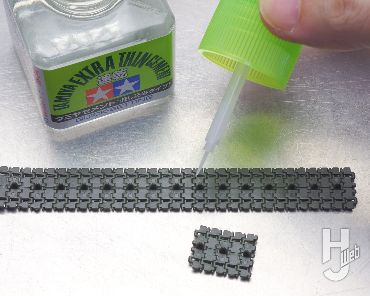▲ 戦車の履帯で凹凸が噛み合う接着部分。余分に接着剤を付けたくないところも流し込みタイプが向くところです。例は早めに乾くタイプを使って周囲のモールドに流れ込まないようにしています。接着後に角度を調整するところなら乾燥が遅めなタイプを使うなど、状況によって使い分けましょう