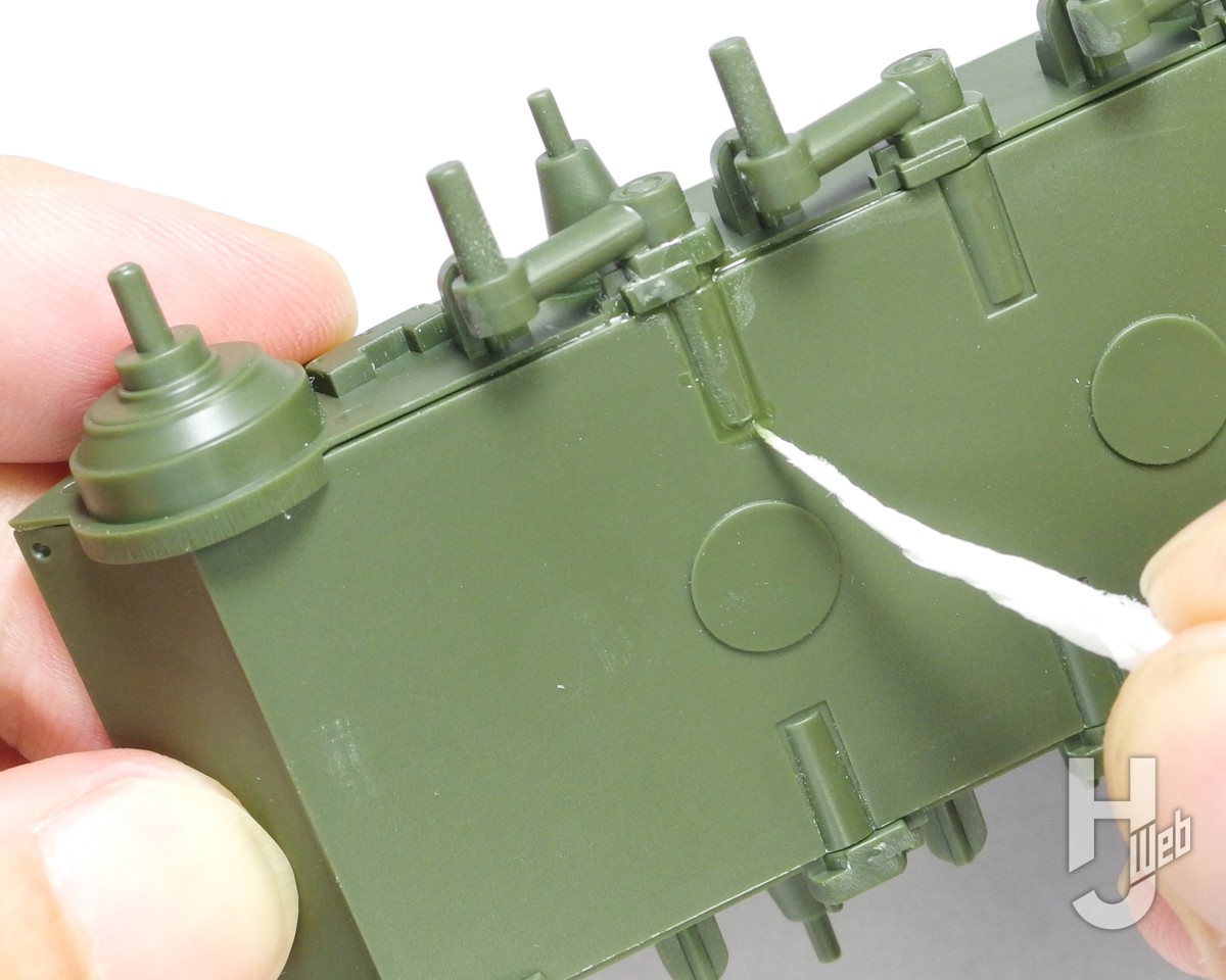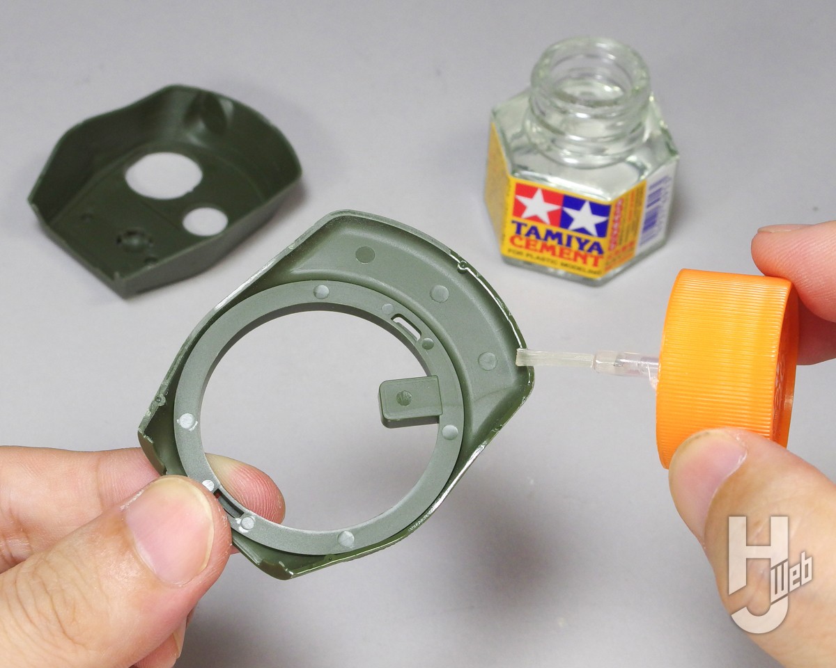 ▲ 塗装後の接着はハミ出しが怖いのでプラセメントでは気を使うところ。流し込みの速乾はハミ出し跡になりにくいのでこうした接着にも便利です。とはいえ目立つ箇所ではプラセメントは避けましょう