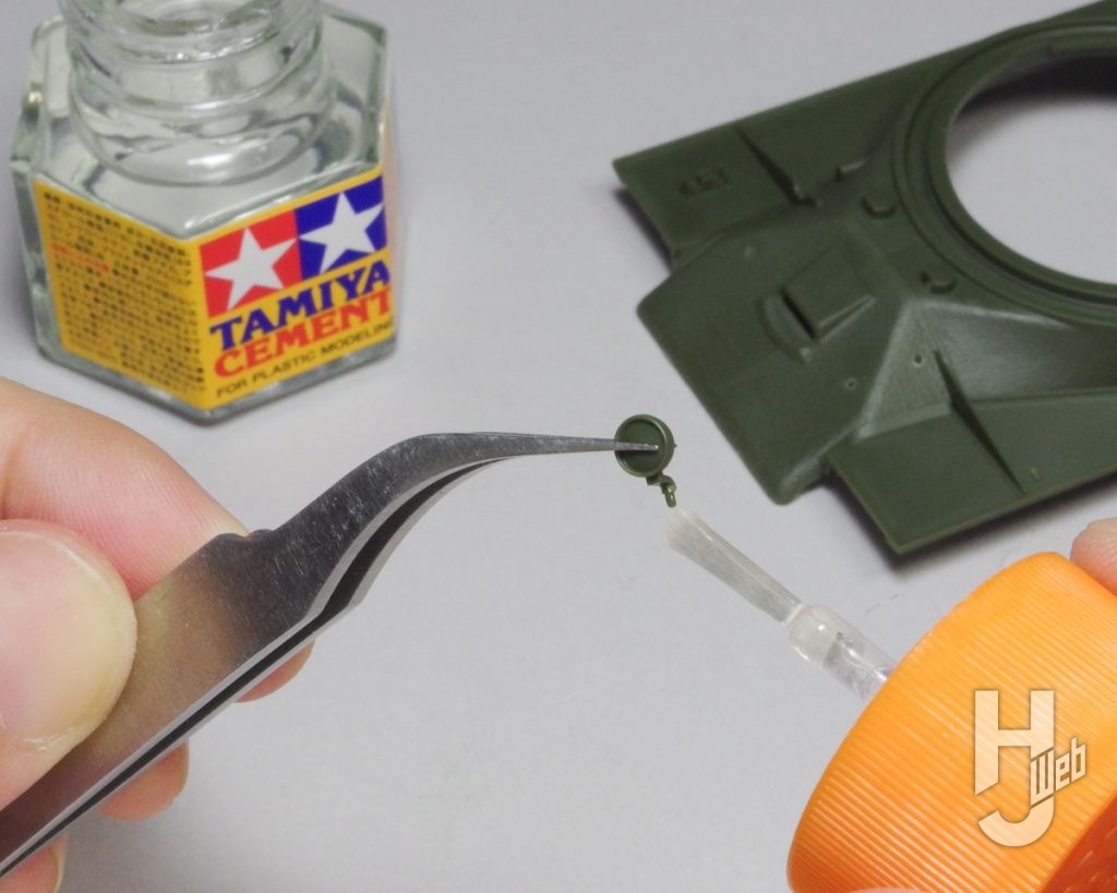 ▲ 小パーツなどの取り付けでピンに塗る接着。ピンセットで扱うことで取り付けや向きを調整がしやすくなります。取り付けたら乾くまでに向きを整えておきます