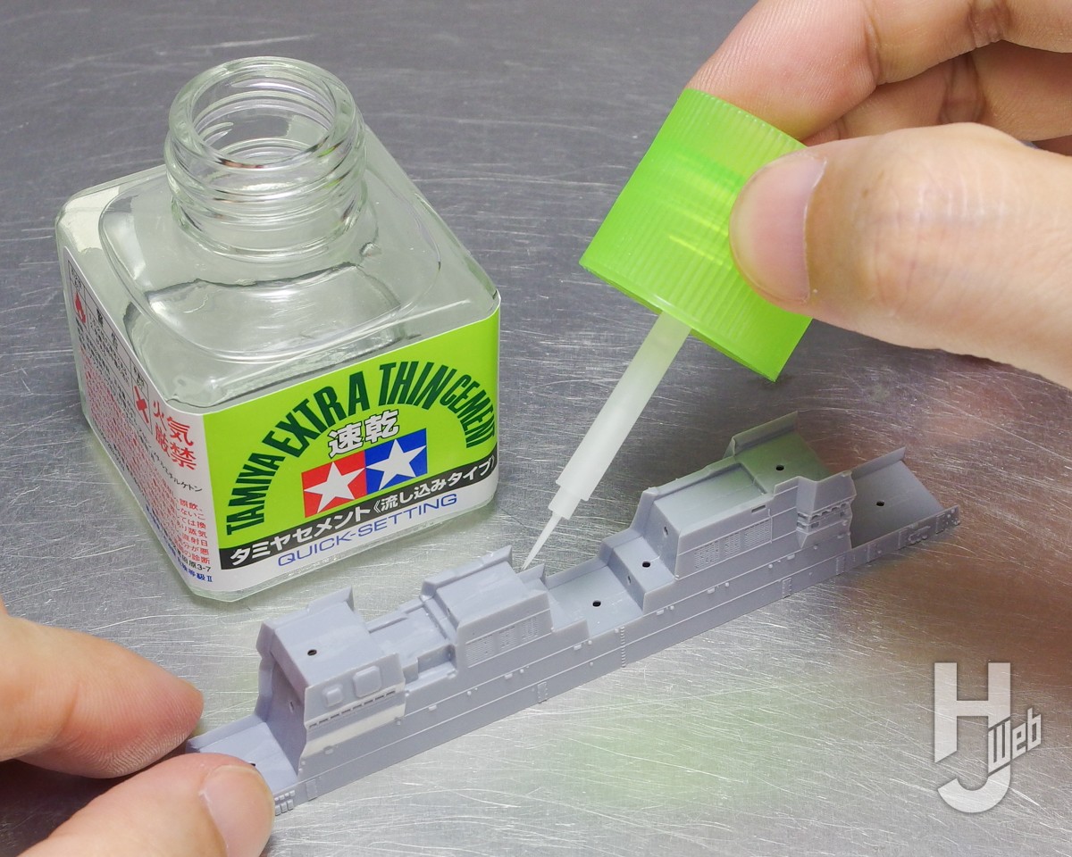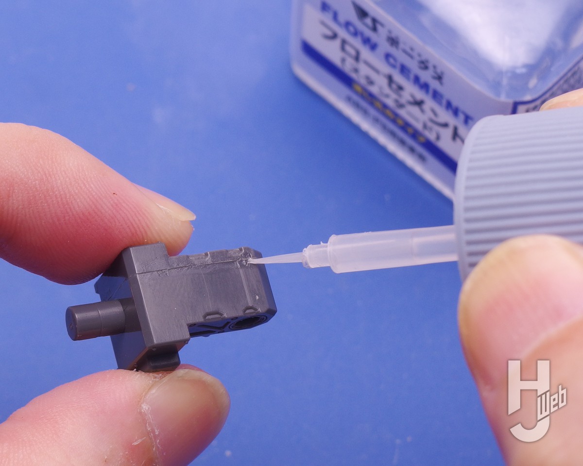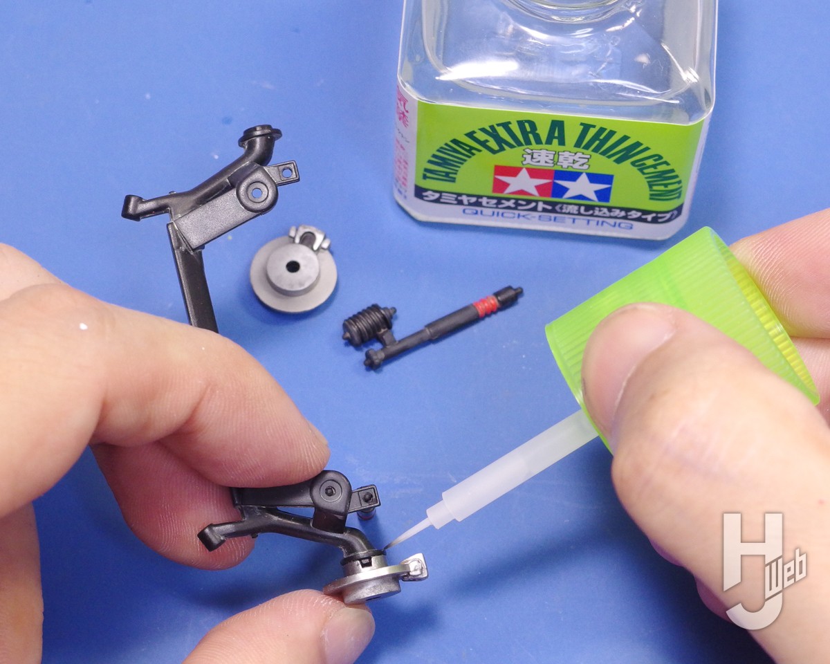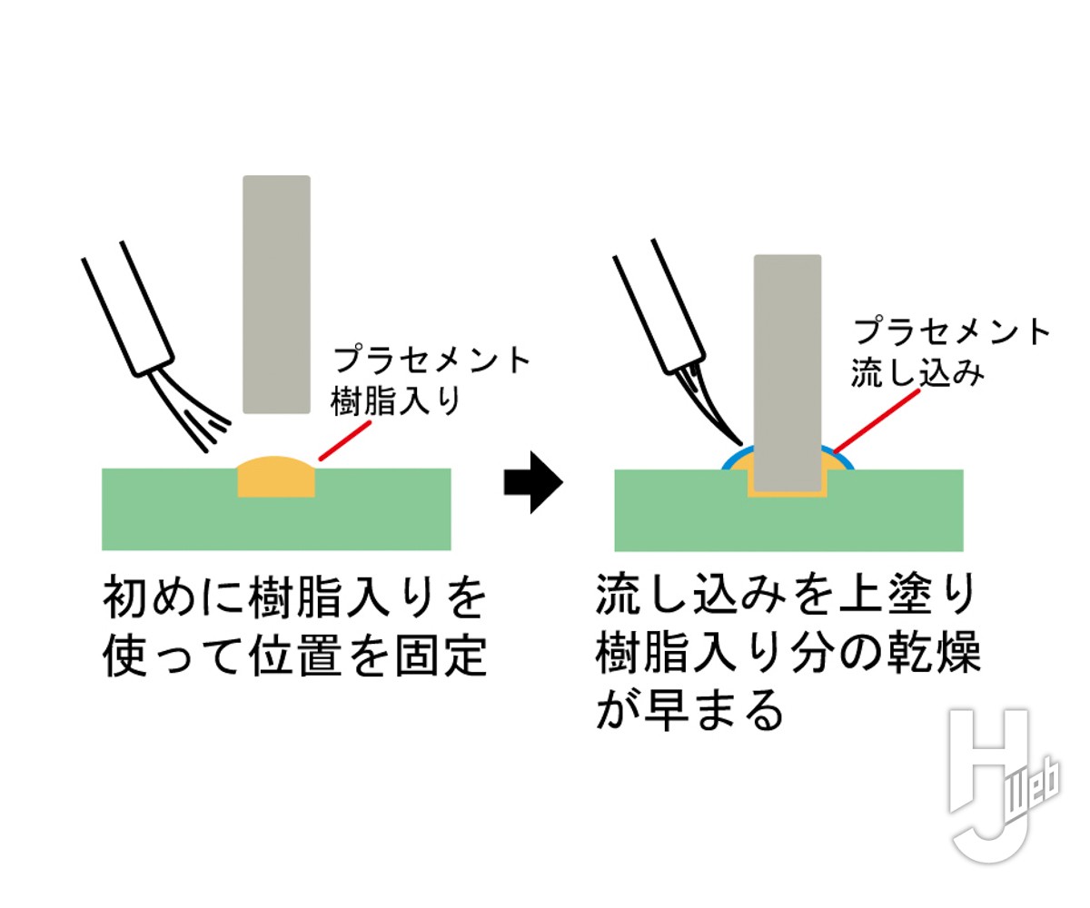 ▲ 樹脂入りセメントでの接着部に流し込みの“速乾”タイプを塗りたすことで、乾きを速めることができます。小パーツの固定やハミ出しの処理が進めやすくなります