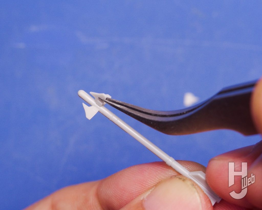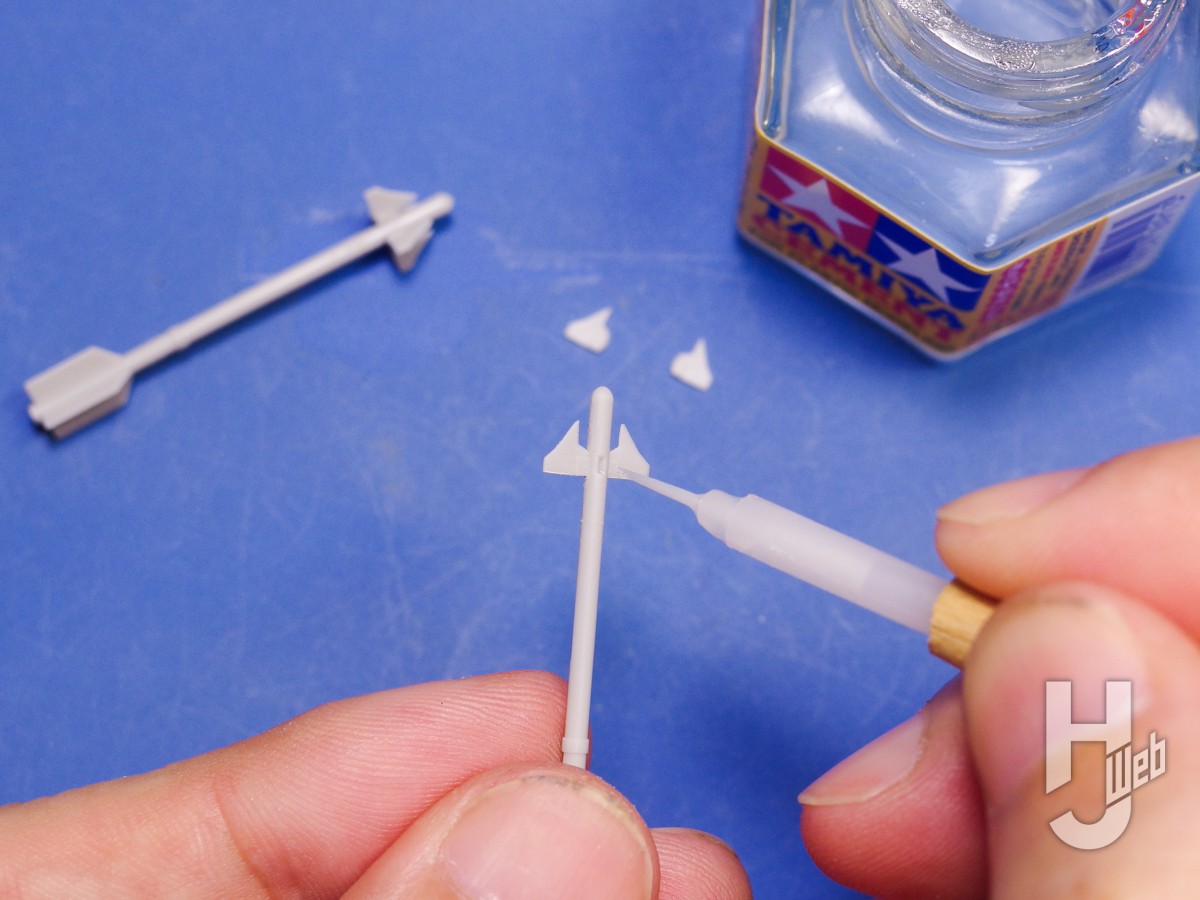 ▲ ミサイルの小翼をつけるパーツ。接着面が小さくダボも浅めでグラつきやすい箇所の例。凹みに少しだけ塗るため、流し込み用の細いハケを使っています。その後に小翼を接着。傾かないようにピンセットで少しの間押さえておきます