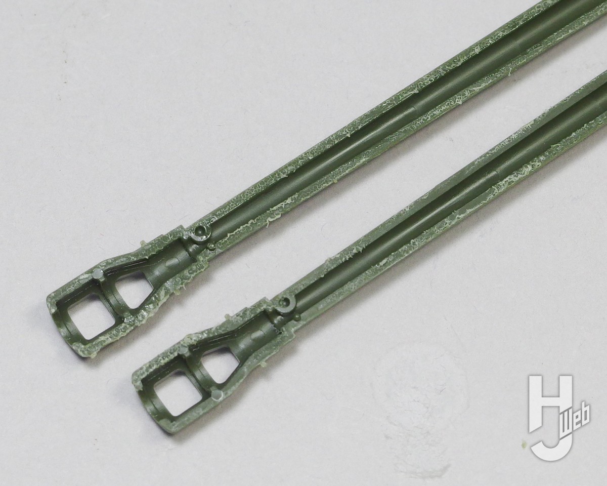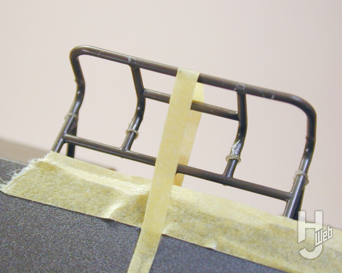 ▲ 細い棒を繋ぐような接着箇所。位置がズレないようマスキングテープで押さえておきます。この例は樹脂入りセメントをハミ出すくらいにし、合わせ目を埋めるようにしています