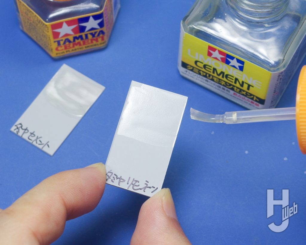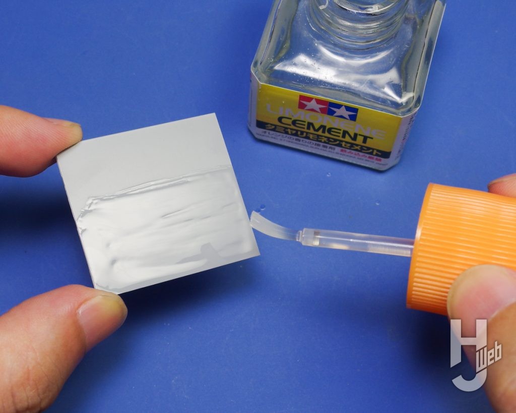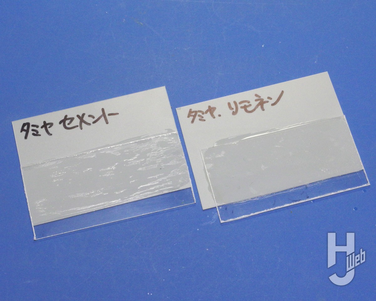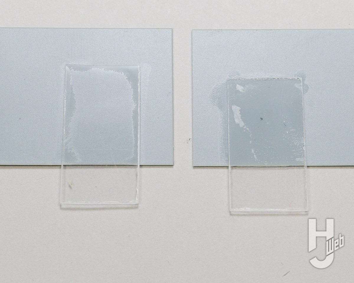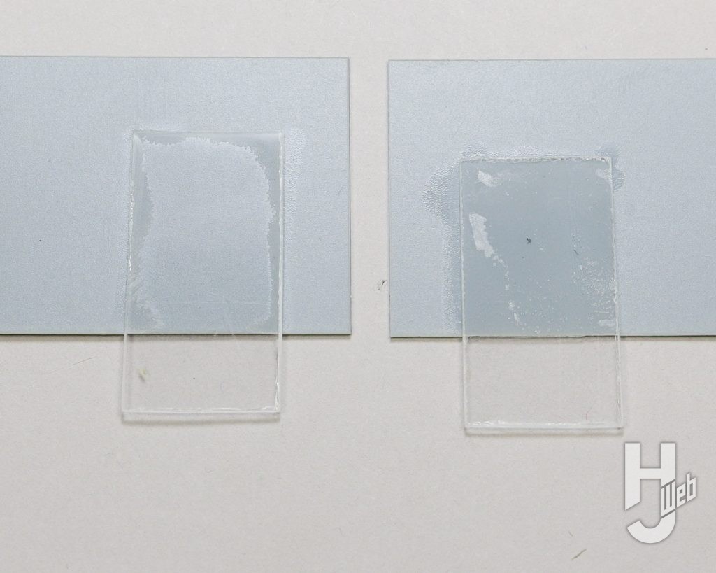 ▲ このタイプは臭気が抑えられている他に乾燥時間が長めな傾向ががあります。樹脂入りでは通常のものよりも塗り広げやすく、作業時間も取れます。例は透明プラ板を貼ったもので、その接着面がムラ無く密着しているのがわかります
