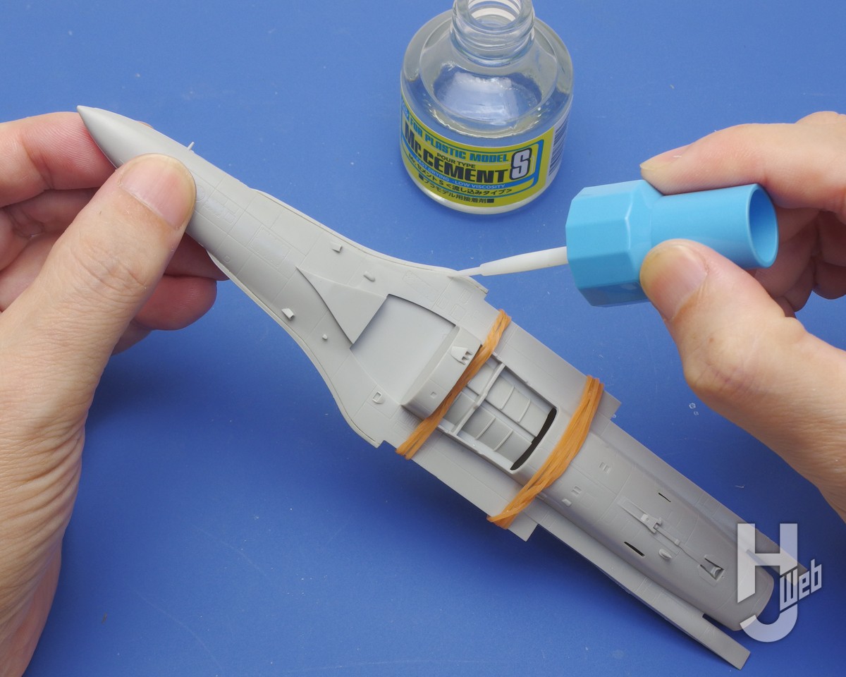 ▲ こちらは戦闘機の機体全体を貼り合わせる場面。パーツの合わせておき、接着面の隙間からセメントを流して合わせていきます。乾燥まで少し時間があるタイプを使うと合わせ目の閉じ具合を微調整できます