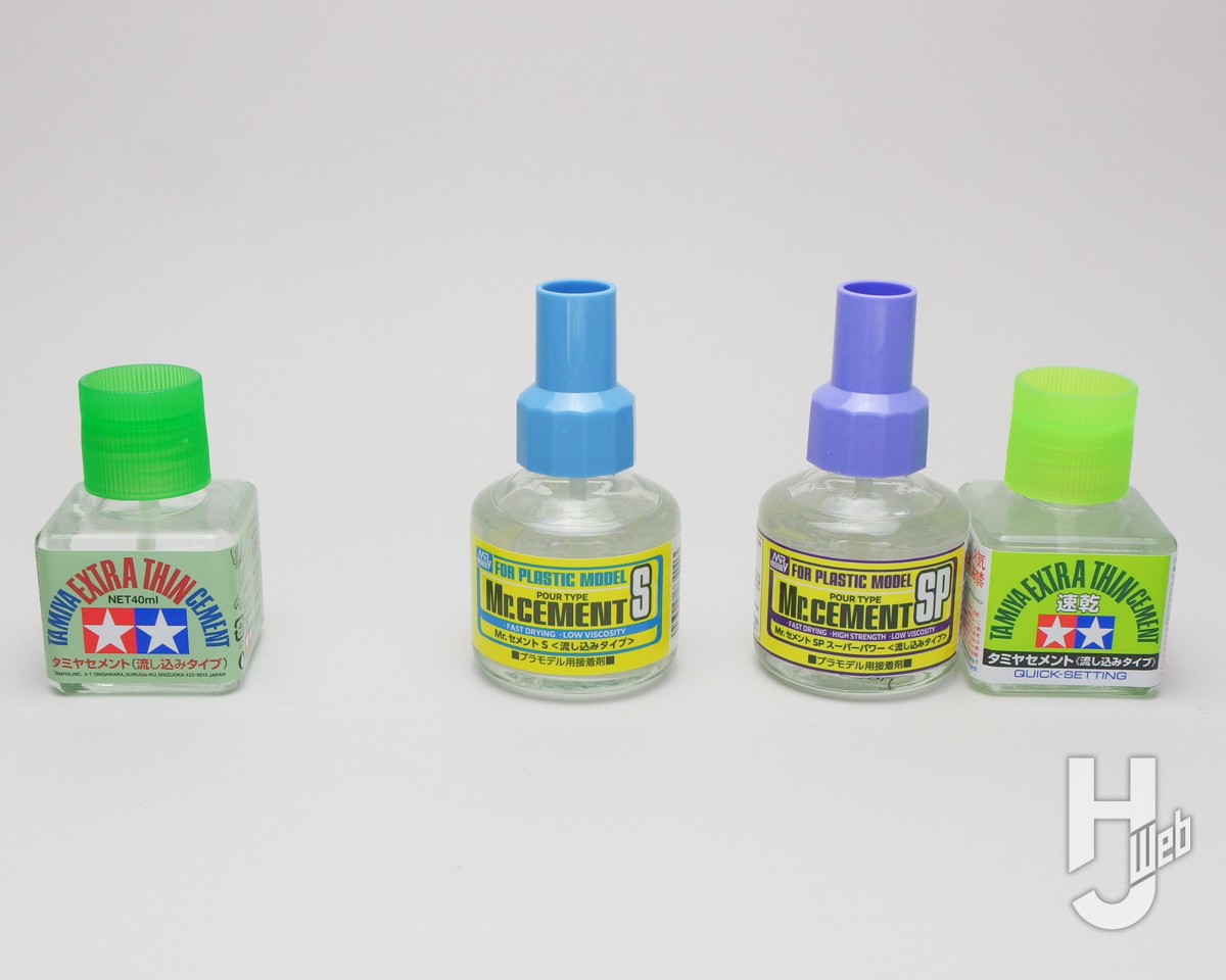 ▲ 流し込みタイプは“乾きのスピード”で使い分けることもあります。この画像は「遅い→速い」順に並べたもの。タミヤセメント(流し込みタイプ)は遅めで、同「速乾」とMr.セメントSPは同等に速いもの。Mr.セメントSはその中間よりも速めとなります