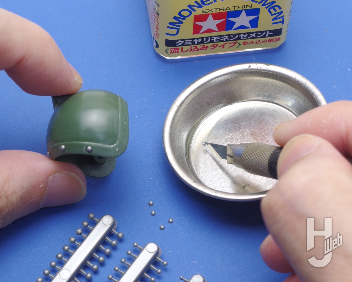 ▲ リベットなど小パーツを繰り返し貼る場面では、流し込み用を接着面に少し付けて貼るとハミ出しもなくキレイに接着できます。この作業でリモネン系流し込みを使うと皿に出しておいても揮発しないので、作業がしやすくなります。素材によっては溶けにくい場合もあるので事前に確認しておきましょう