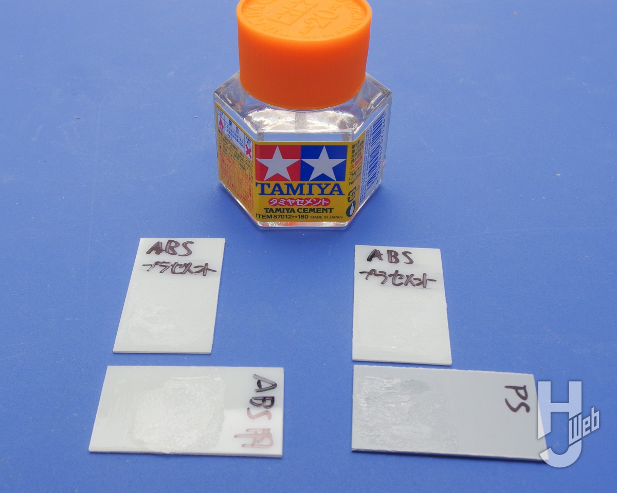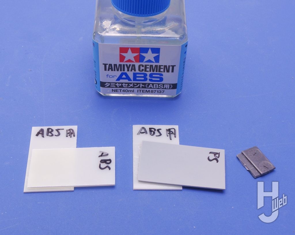 ▲ 試しにプラセメント(樹脂入り、スチロール用)でABS+ABS、ABS+プラ板を接着してみました。どちらも溶けはしますがしっかり固定されず、剥がせる状態となりました