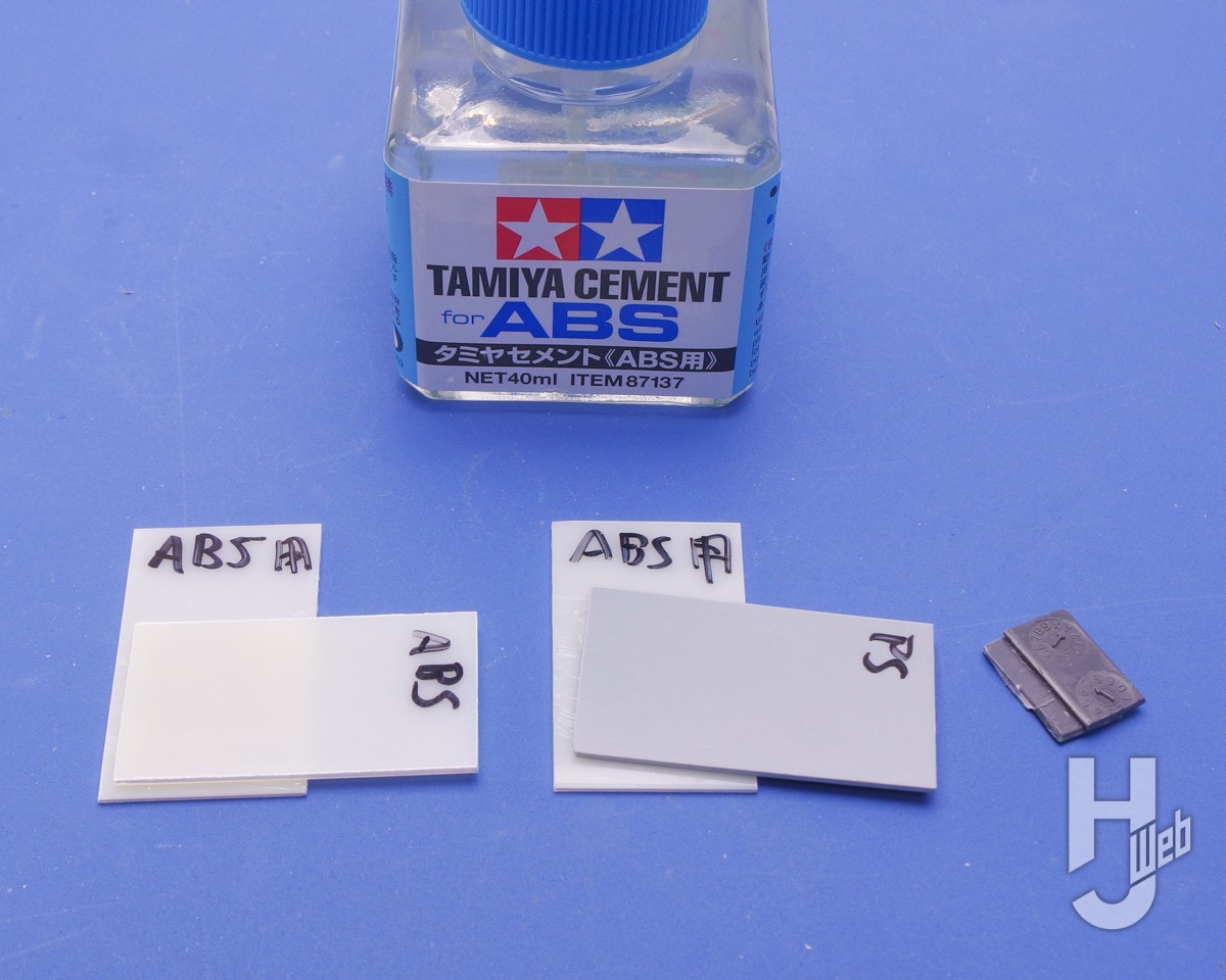 ▲ タミヤセメントABS用で素材の接着テストをしてみました。市販のABS板+ABS板はしっかりと接着。ABS板+プラ板はそれほど強固ではなく、ズラしたり剥がせるくらい。左はキャラクターモデルのランナータグ(ABS)を重ねたもの。これもしっかり接着されました