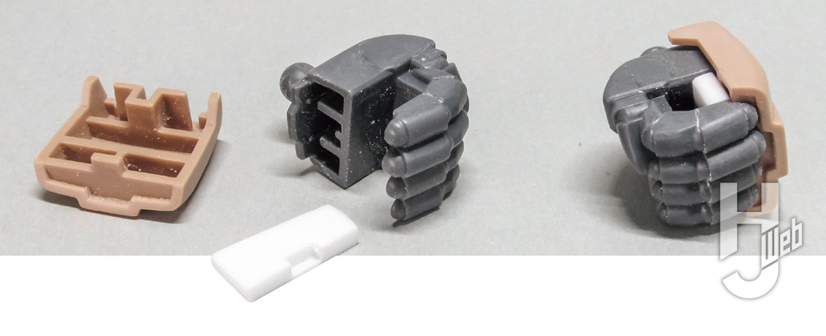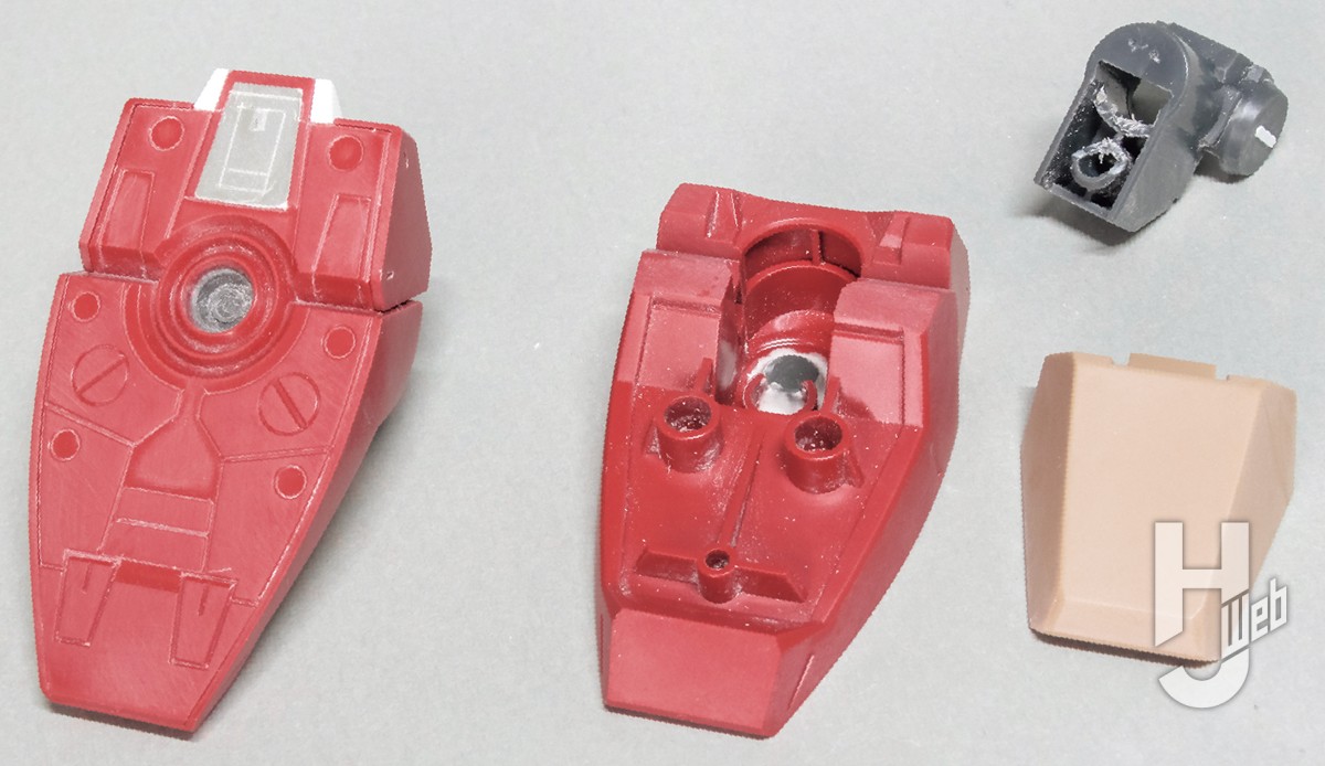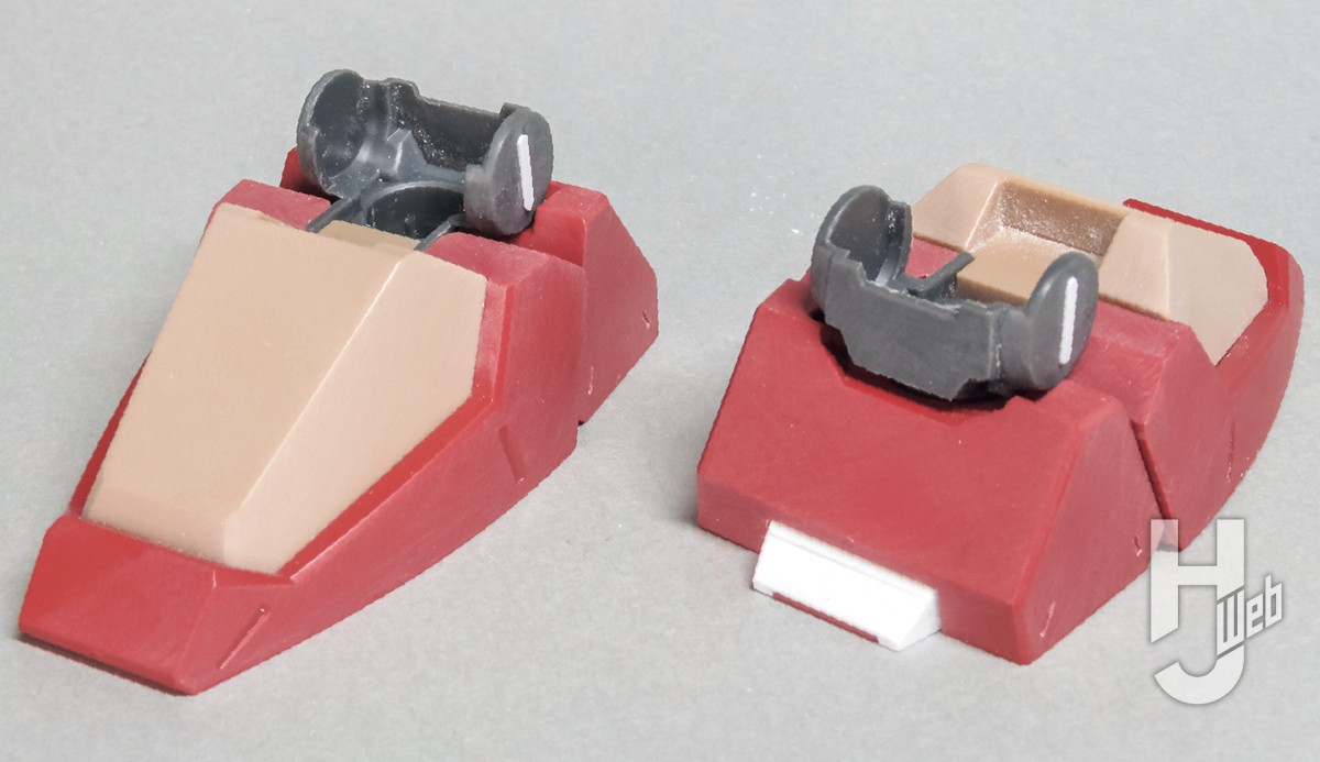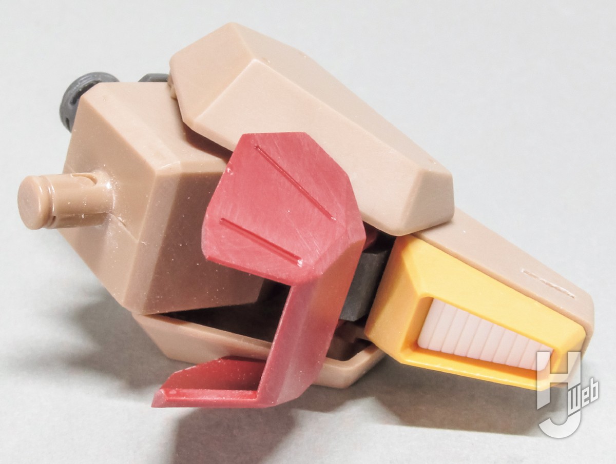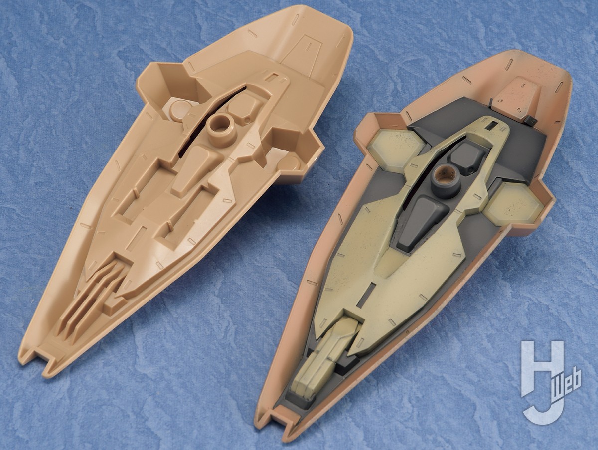 設定資料を参考にして、脇下にあるビーム・サーベルラックを展開できるようにしています。胴体内部は意外と隙間がないので、パーツの省略化と差し替えで再現しました。