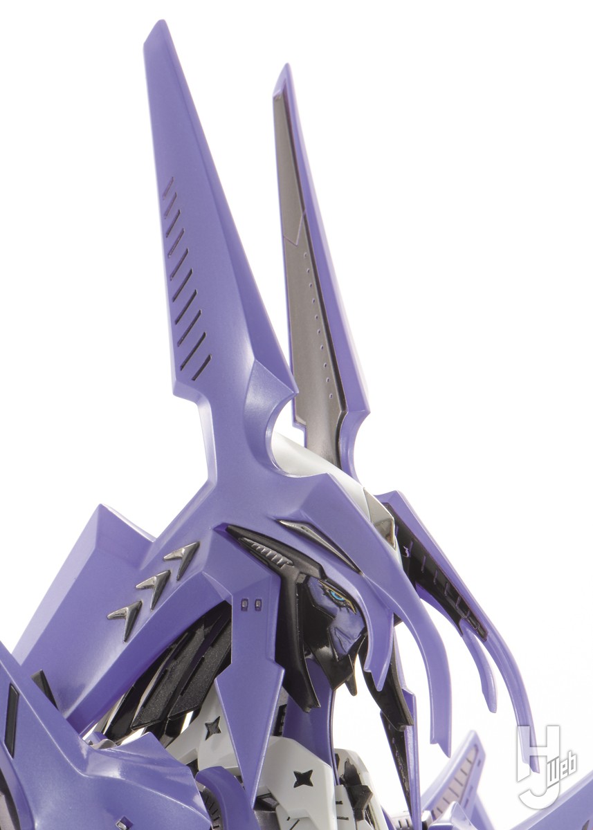 HSGK最新作は、ブラウニー・ライド博士の設計したホルダ型GTM「メロウラ/バンシーカ」です。本キットでは、「デザインズ4」に準じたフィルモアマーキング(ラベンダー)と、映画『花の詩女 ゴティックメード』登場時のドナウマーキング(ウルトラマリンブルー)の「メロウラ」2種を、パーツ選択式で再現可能。さらに、付属デカールと塗装表現によってバンシーカ(アイスブルー)も再現可能な豪華仕様でお届け。髪の毛のように垂れ下がる4つの張り出しや、矢尻のような頬あて、後方に長く伸びるラジエーション・フィンまで一発結晶成型で作られていると言われる超複雑な頭部形状は、クリアーレジン一発抜きで設定通り再現。見所満載の本騎を、ぜひ「ダス・ゴースト」などの同型騎と並べてお楽しみください!