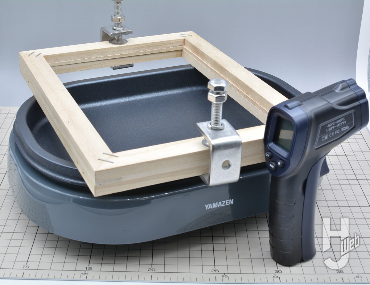▲ 1.0mm厚のプラ板を木枠にはさんで固定し、ホットプレートで約140℃に加熱(放熱測定器で確認)。素早く治具に押し付ける