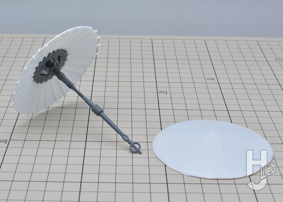 ▲ 傘の形状になったプラ板を切り出して、1mmのプラ角棒で親骨、30MM カスタマイズウェポンズ(ファンタジー武装)で小骨と柄、石突きを製作。メカファンタジー風にデコレートした