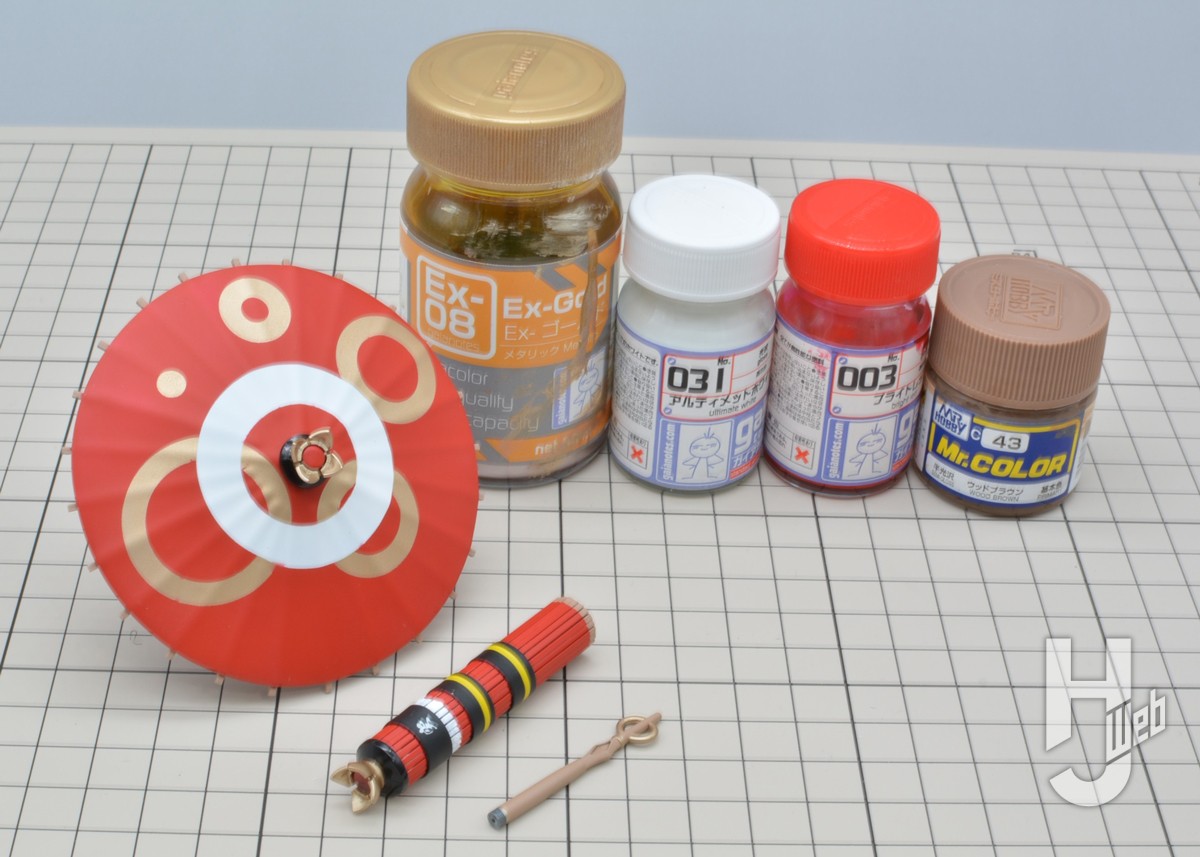 ▲ Ex-ゴールドを下地にブライトレッドで基本塗装。白い輪っかはアルティメットホワイト、親骨と柄はウッドブラウンで塗装。閉じた状態の和傘はプラパイプを芯にプラ棒で覆うようにして製作