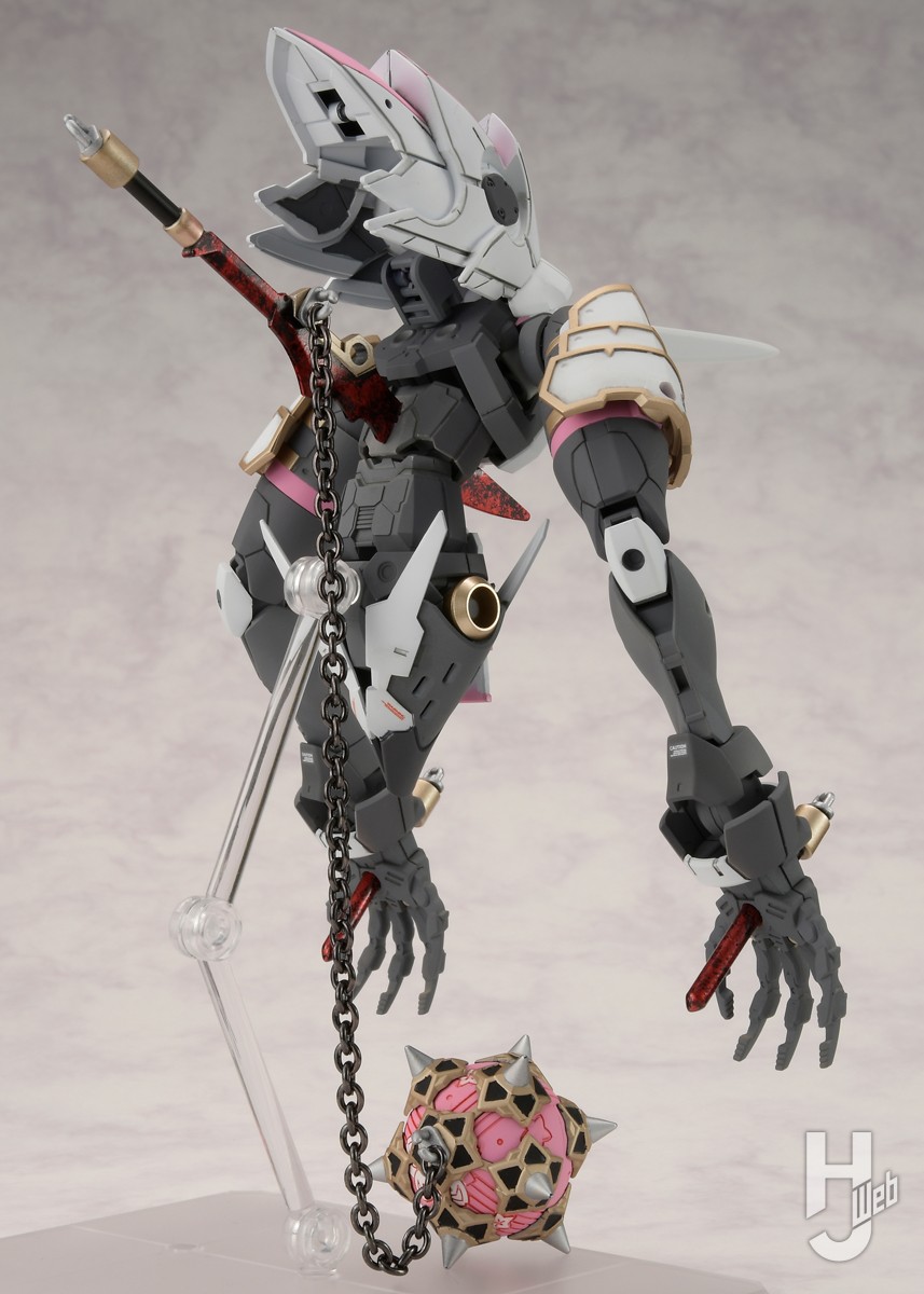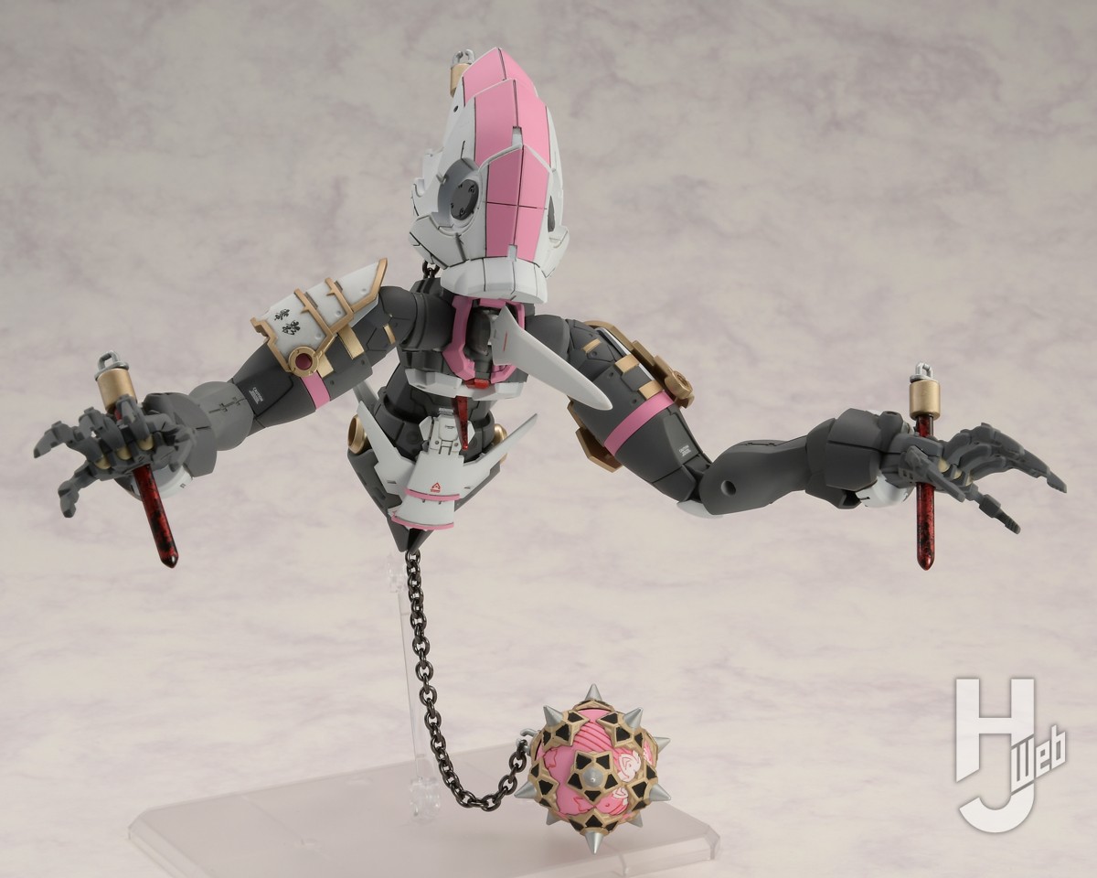 ▲ 頭と脚がなく、長い腕を持つ異形の存在。胸には剣、両手のひらには杭が刺さり、枷のように鎖でハンマーにつながれている。その姿は、無理矢理拘束され使役されているようにも見える。30MF リーベルナイトをベースに、脚を腕として使用し、頭がない異形のシルエットを構成。ソウレイ(大正鬼娘)と同様に30MM オプションパーツセット4(戦国アーマー)を組み合わせて関連性を持たせている