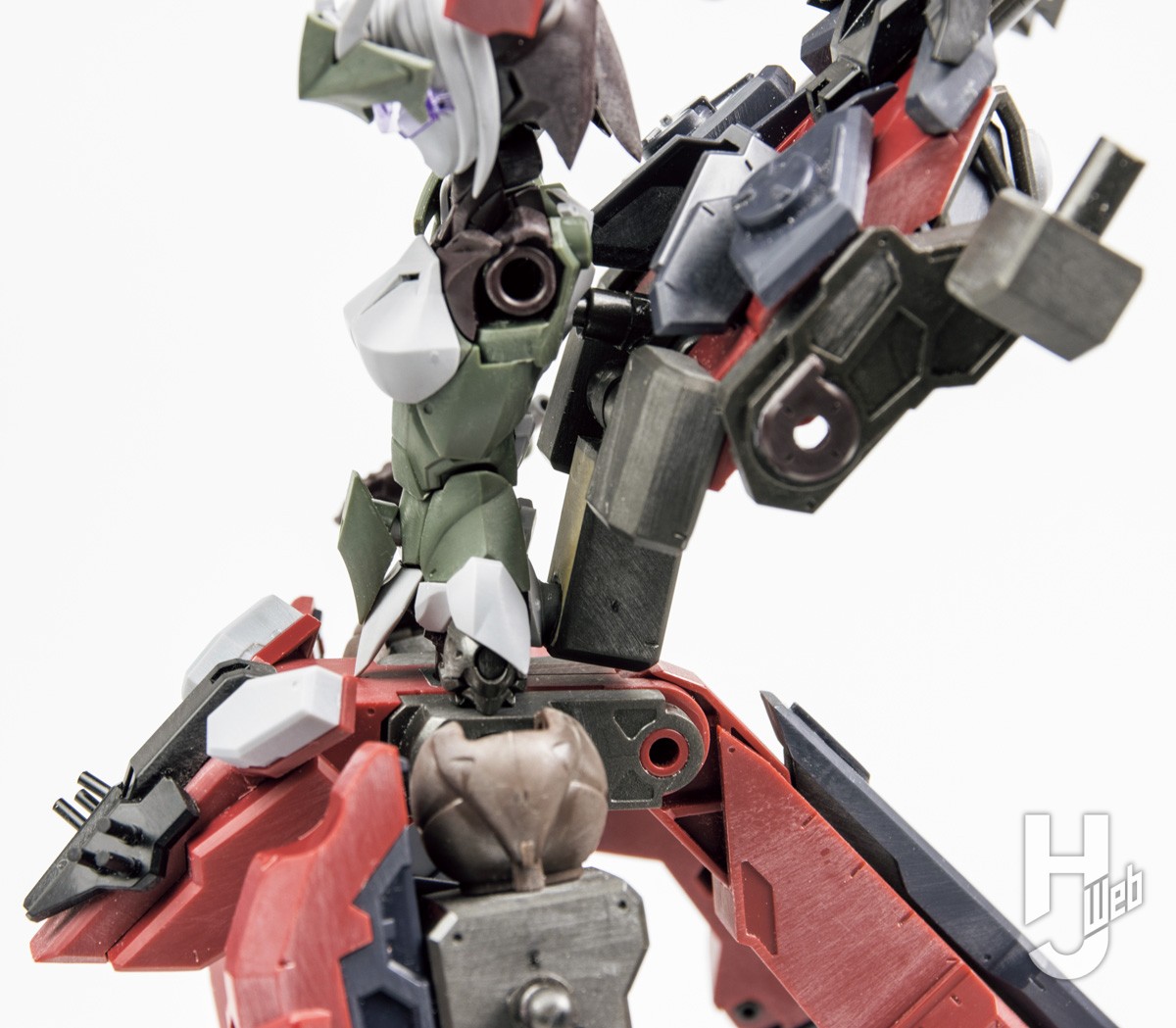 関節強度を考えつつ、ペネトレイターをコアとしてヴェローチェの手足を取り付けています。脚の接続軸はブイトールと同じものを使用。腕ユニットはヴェローチェ付属の関節パーツを組み替え、バックパックから接続することでサブアームとしています。肩のタイヤパーツはピンを一部カット、360°回転できるようにして腕まわりの可動域を拡大。変形用のジョイントやピンをうまく活かしつつ、全体のフォルムを構築しています。