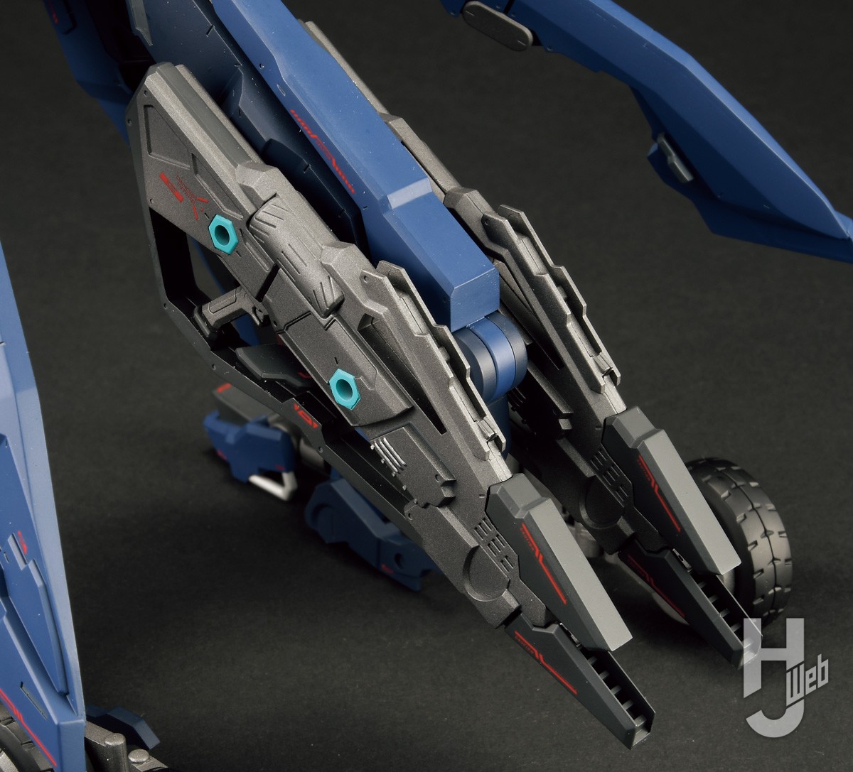 外装はネイビーを基調で統一。ベースカラーはブルー FS15050、部分的にディープオーシャンブルーとブルー FS15044を混ぜた濃紺を塗装し、色味の違い付けています。外装や関節部はインナーブラックとガンメタで塗り分けて、さらに差し色として鮮やかな水色を加えることで視覚的なメリハリを持たせています。