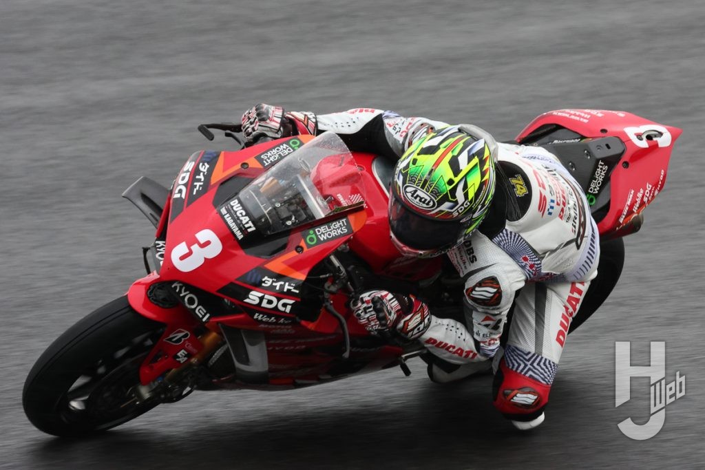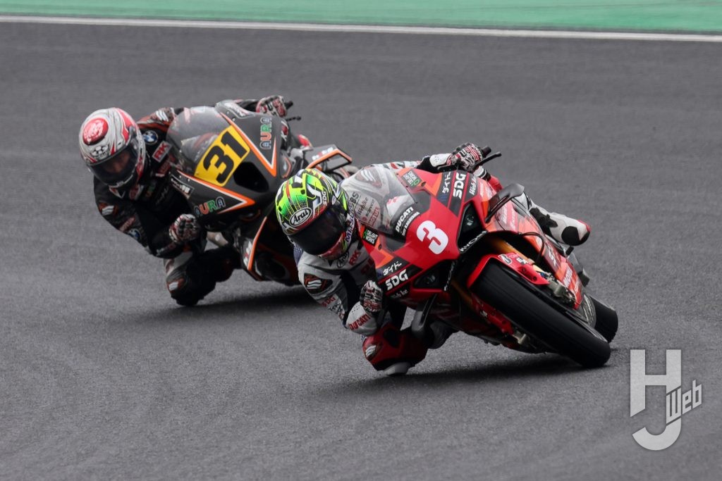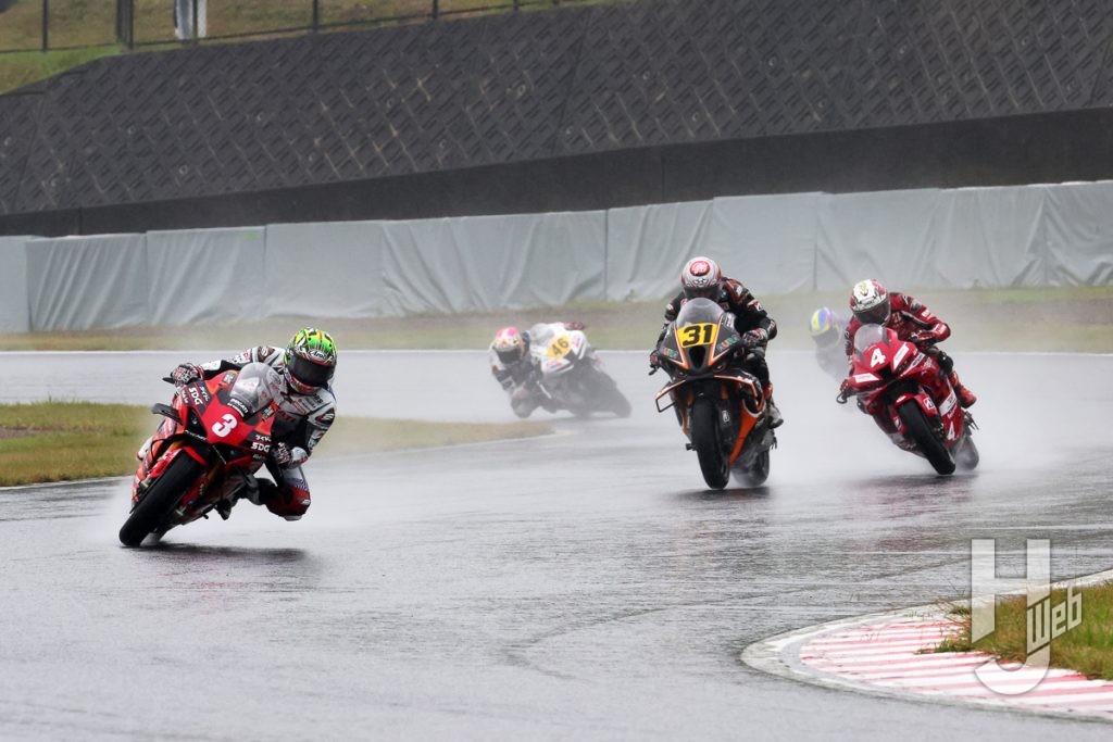 レース1では予選3番手の水野涼(DUCATI Team KAGAYAMA)がホールショットを奪い、ポールポジションの#31浦本修充(AutoRace Ube Racing Team/BMW)が続く。水野、浦本は序盤から後続を引き離しにかかり、3番手以降は激しくポジションを入れ替える。徐々に雨脚が強くなるなか、水野はハイペースでラップを重ね、浦本をも引き離し、レース中盤には独走状態を築き上げる。3番手は津田拓也(Team SUZUKI CN CHALLENGE)、4番手#14日浦大治朗(Honda Dream RT SAKURAI HONDA)、5番手に#10長島哲太(DUNROPRacing Team with YAHAGI/ホンダ)が続く。