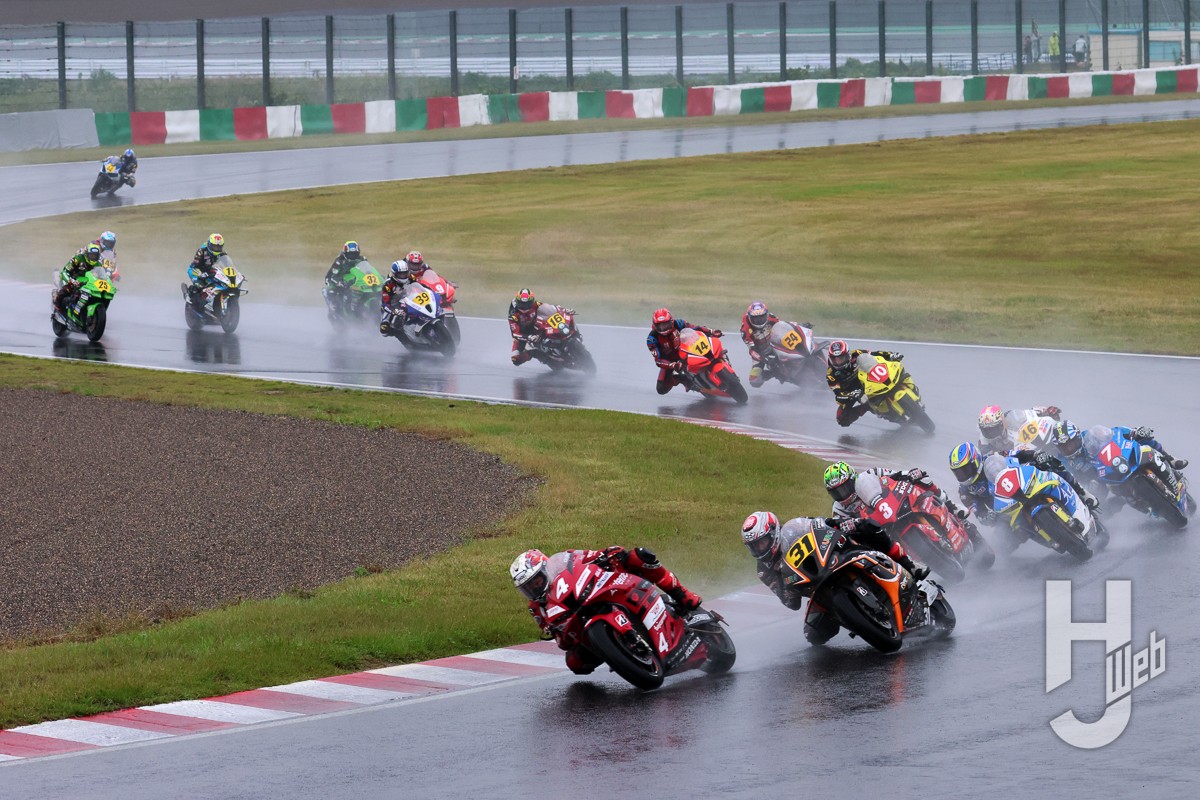 レース1では予選3番手の水野涼(DUCATI Team KAGAYAMA)がホールショットを奪い、ポールポジションの#31浦本修充(AutoRace Ube Racing Team/BMW)が続く。水野、浦本は序盤から後続を引き離しにかかり、3番手以降は激しくポジションを入れ替える。徐々に雨脚が強くなるなか、水野はハイペースでラップを重ね、浦本をも引き離し、レース中盤には独走状態を築き上げる。3番手は津田拓也(Team SUZUKI CN CHALLENGE)、4番手#14日浦大治朗(Honda Dream RT SAKURAI HONDA)、5番手に#10長島哲太(DUNROPRacing Team with YAHAGI/ホンダ)が続く。
