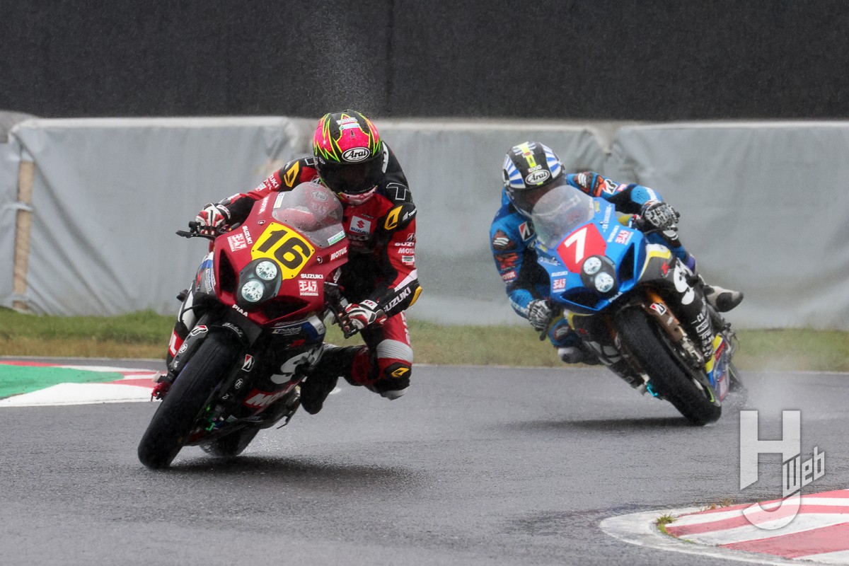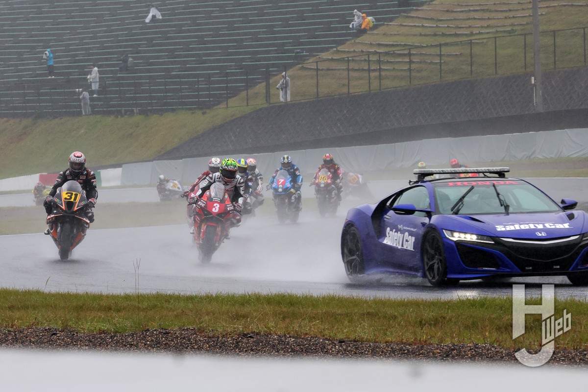 雨足がさらに激しくなる中、各コーナーで転倒車が発生。12周目には長島がS字で転倒し、13周目には3番手走行中の津田が逆バンクで転倒。そして同じ周に発生した110Rでのクラッシュに起因して赤旗が掲示された。この結果、12周目を終えた時点でのポジションでレースが成立。優勝は水野、2位浦本となり、津田がピットに戻って来られなかったために3位日浦という結果となった。