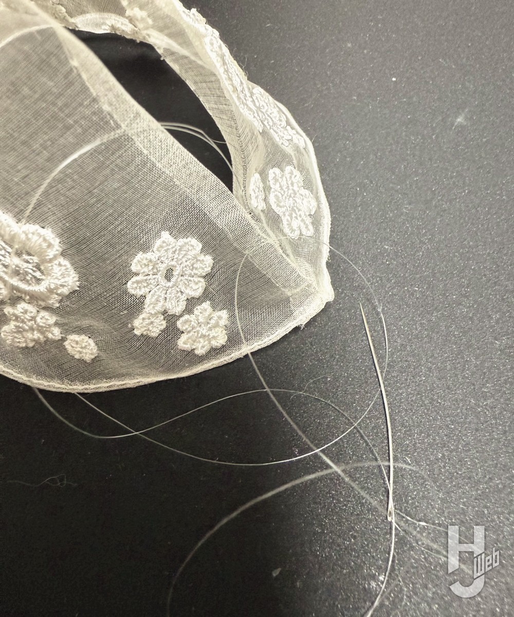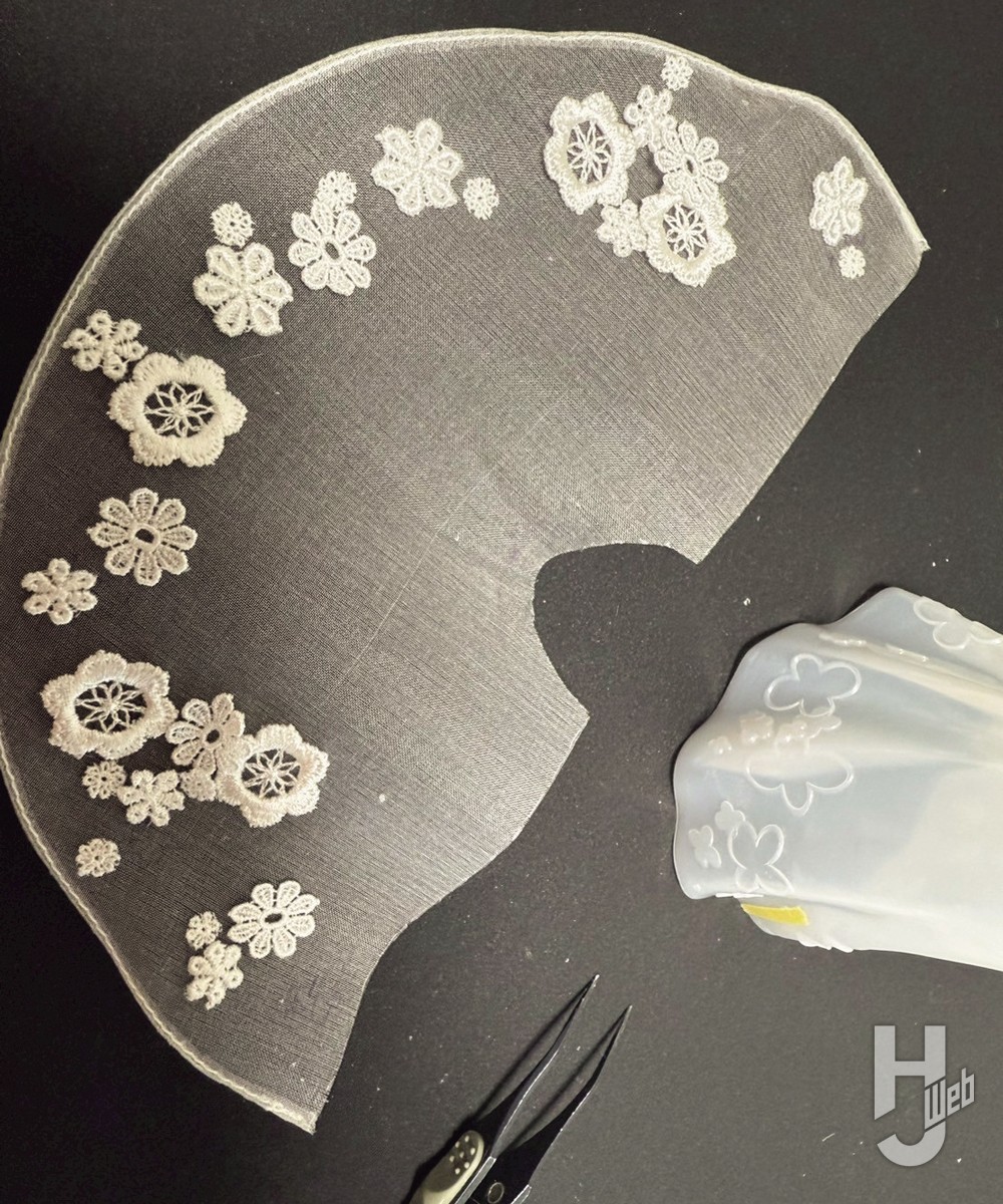 衣装は各パーツをベースに型紙を起こし、衣装それぞれのパーツに色や透け感が近い生地を用意。クラフトボンドを使用する場合、ポリエステルなどの生地では貼り付かないため綿素材を選んでいます。オーバースカートの透け感がある生地には、シルクオーガンジーを選びました。このスカートは着脱できる仕様で、着崩れを防止して固定するために薄手両面テープを使いました。