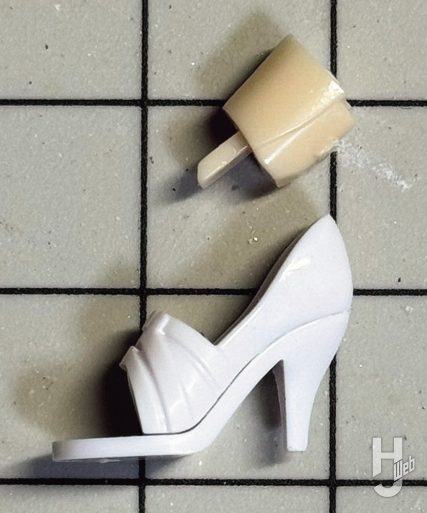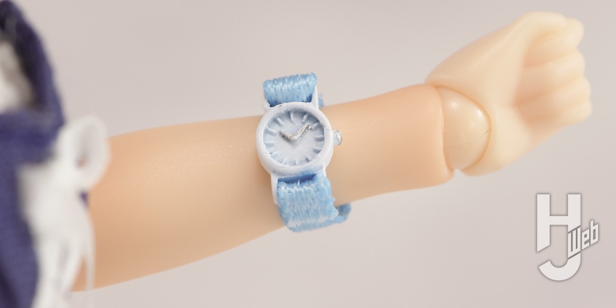 工作部分としては、足首パーツは後ハメ加工ができるように肌パーツを切り離しています。ハンドバッグも同様に上下で塗装後に組めるように切り離しました。また、腕時計は3Dプリンターで製作。ベルト部分にはサテンリボンを使用して布服に合うようにしています。首のチョーカーもサテンリボンに変更し、キット付属のチョーカーの飾りをレジンで複製し貼り付けました。